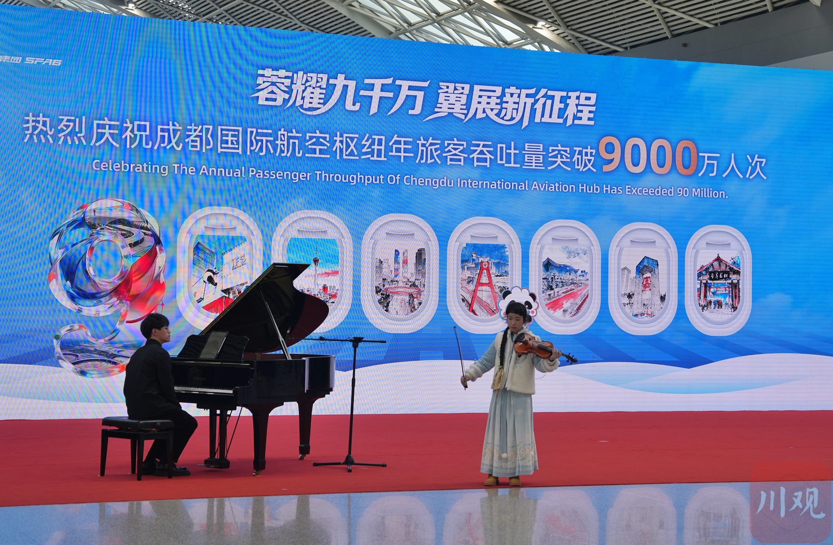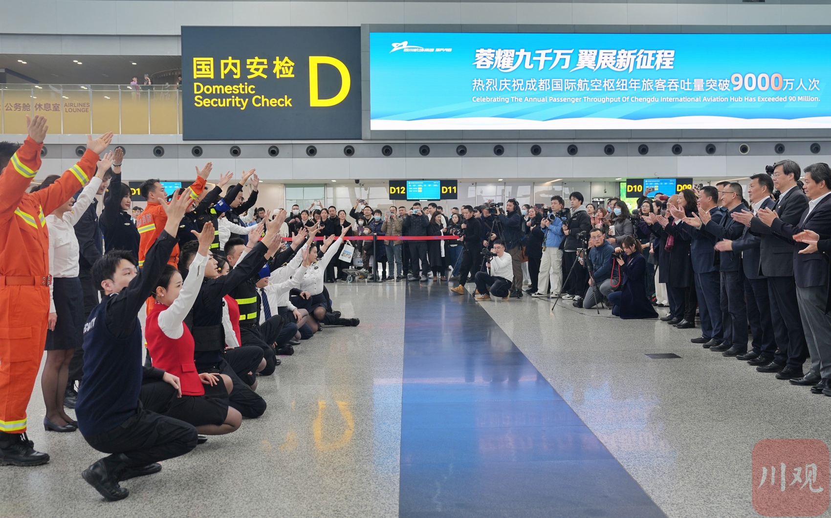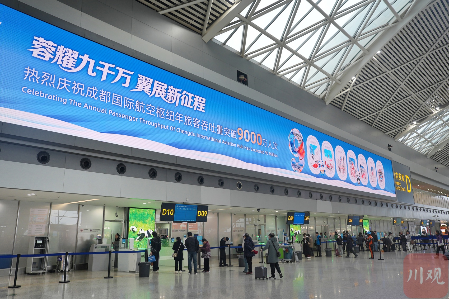 12月31日上午随着从北京飞来的国航CA4182航班平稳降落在成都双流国际机场成都国际航空枢纽(成都天府国际机场+成都双流国际机场)迎来今年的第9000万名旅客。标志着成都国际航空枢纽年旅客吞吐量正式突破9000万人次这是继2023年突破7000万2024年突破8000万后连续三年实现旅客吞吐量的千万级跨越式增长。