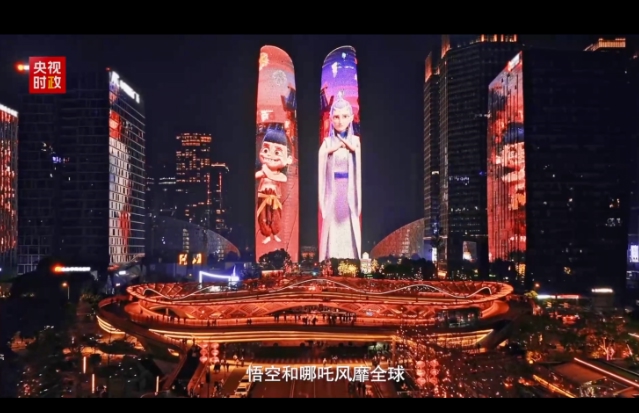 “悟空和哪吒风靡全球”话音中,视频画面出现了成都交子大道:218米的天府双塔上,动画电影《哪吒之魔童闹海》的两位主人公——哪吒和敖丙——活灵活现。