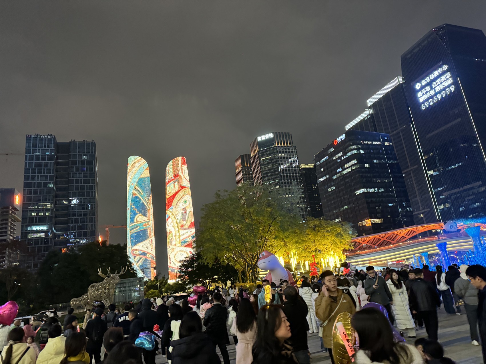 同一时间,四川在线记者正在天府双塔下采访。身边不少市民一边用手机收看新年贺词,一边打卡天府双塔。当看到手机上“悟空和哪吒风靡全球”那句的画面时,现场一下热闹起来。有市民直呼,“来值了!”还有人紧忙拍拍身边同行朋友,抬头看双塔。