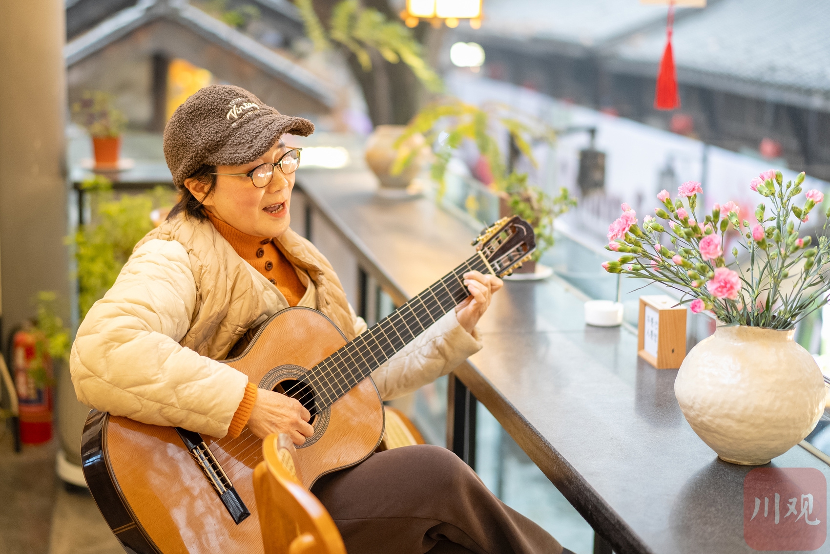 12月30日,唐敏在成都宽窄巷子步行街的一家餐厅弹吉他。