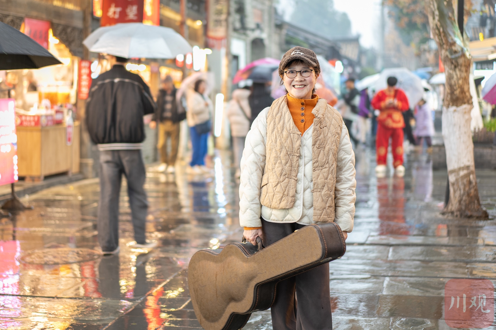 12月30日,唐敏拿着吉他行走在成都宽窄巷子步行街。