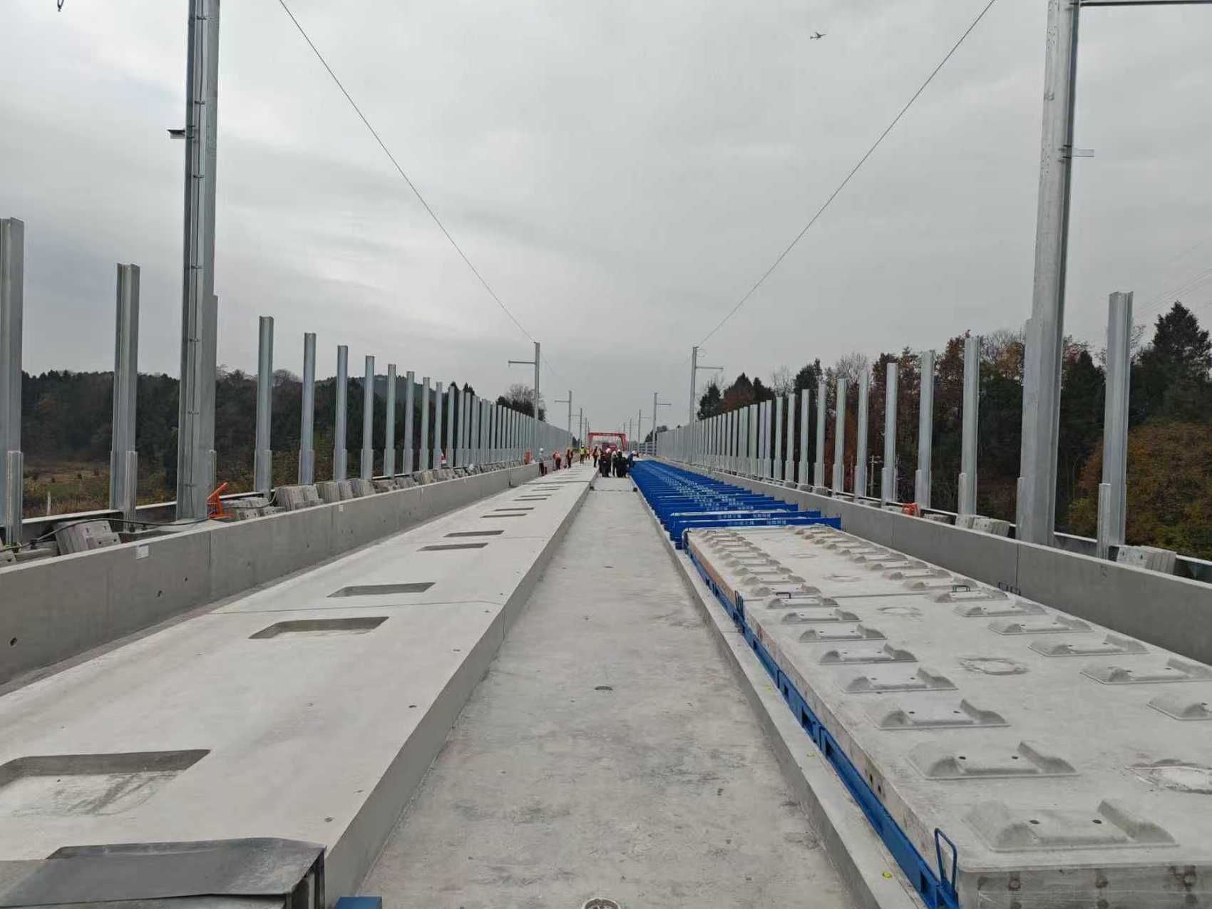 “此次铺设的轨道板均由成简制板厂采用智能化生产线预制,将每块轨道板均嵌入唯一身份识别芯片,做到产品追溯和产品质量控制。”中铁三局成渝中线高铁四川段项目部负责人介绍,不仅如此,施工团队还应用精调机器人,与全站仪数据联动,实现对轨道线形的精准控制。通过先进的智能压杠工装实现曲面地段轨道板的精准定位,达到紧固效果,两种设备一“调”、一“紧”,确保轨道板中线偏差严格控制在±1mm范围内,高程偏差稳定保持在-2mm~0mm范围,做到让旅客乘坐高铁时“杯中水不晃”的极致标准。