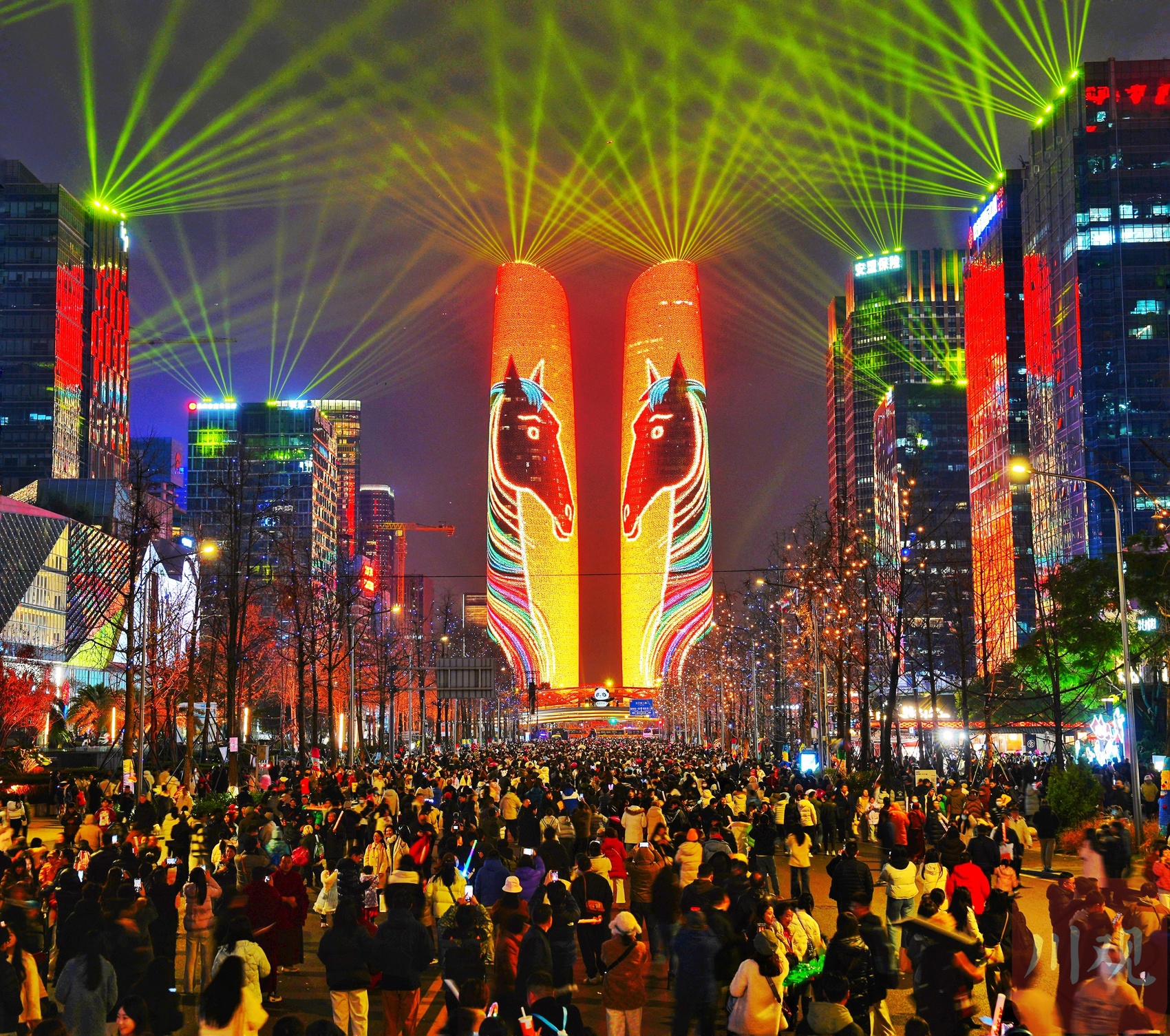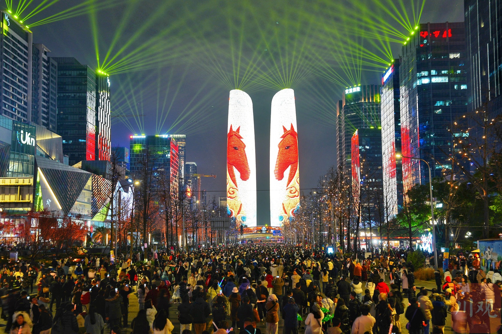 2025年12月31日晚,成都高新区在天府双子塔开启了“成都为你点亮”迎新年灯光秀。“心耀蓉城 以梦为马”“马上转运 幸福加码”等新年祝福的语句让现场市民们的镜头就没放下,熙熙攘攘的交子大道顿时节日氛围拉满。持续到零点的灯光秀,将同市民们一起迎接2026年的到来。