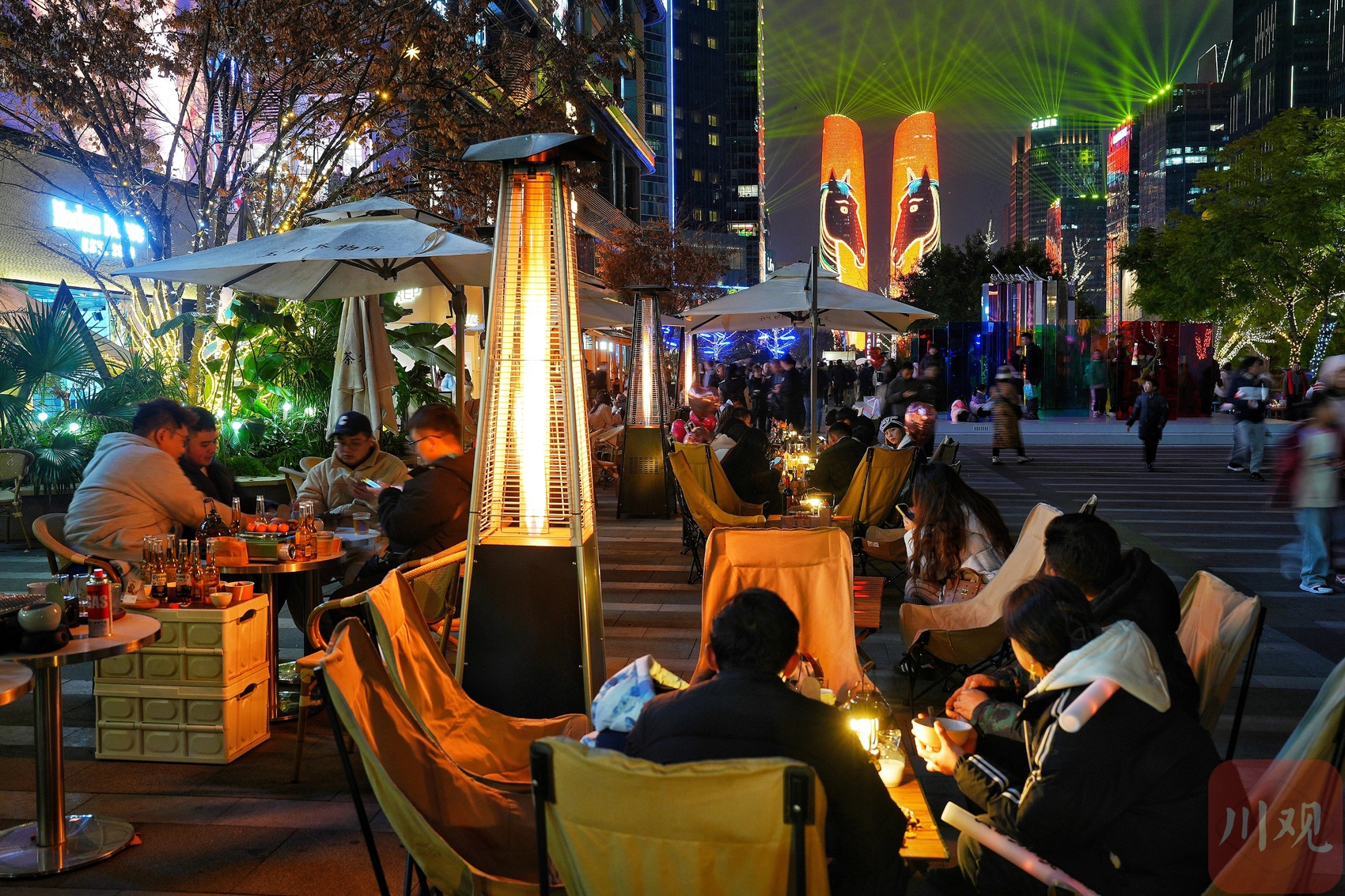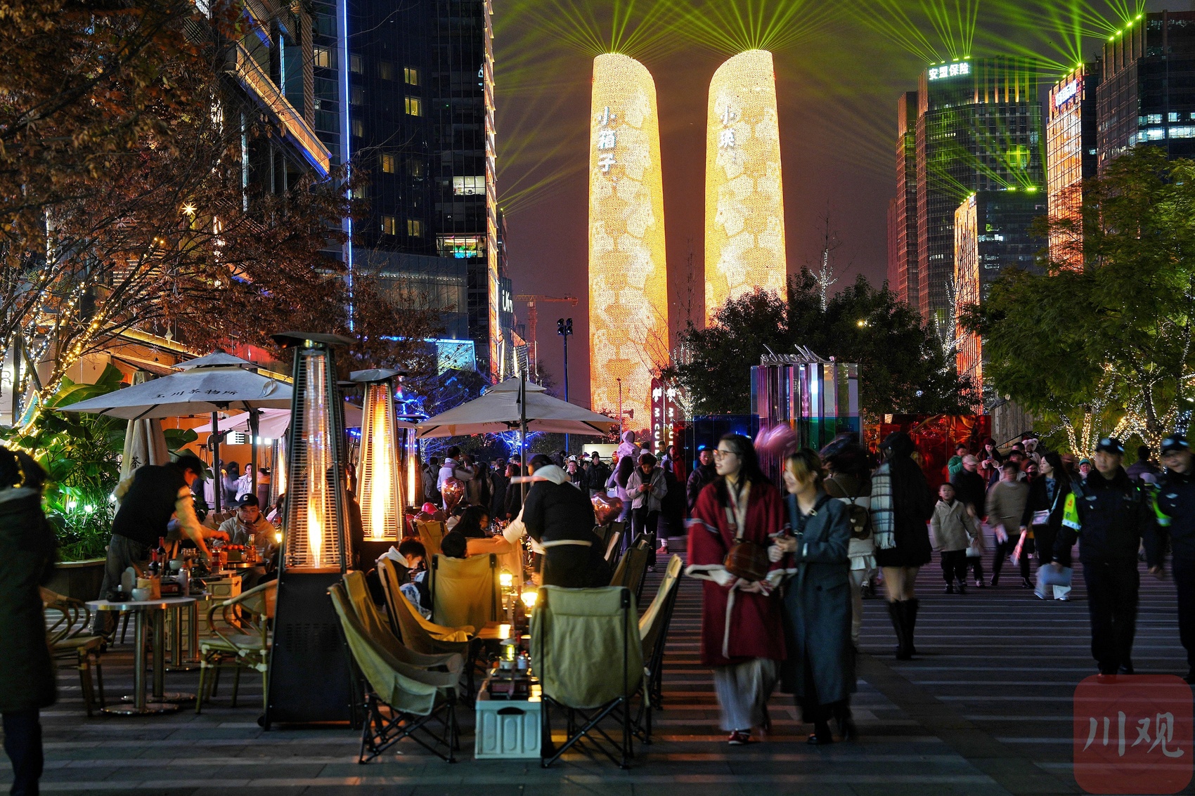 市民在交子大道休闲观赏灯光秀。