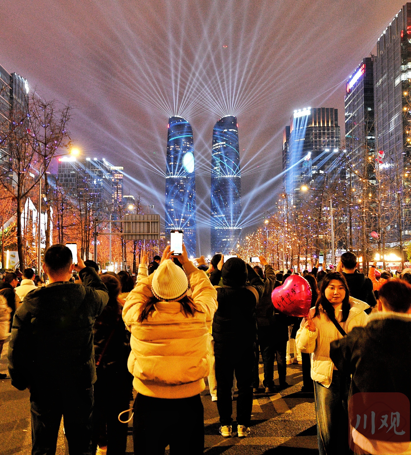 市民们聚集在交子大道观赏灯光秀,共同迎接2026年的到来 。