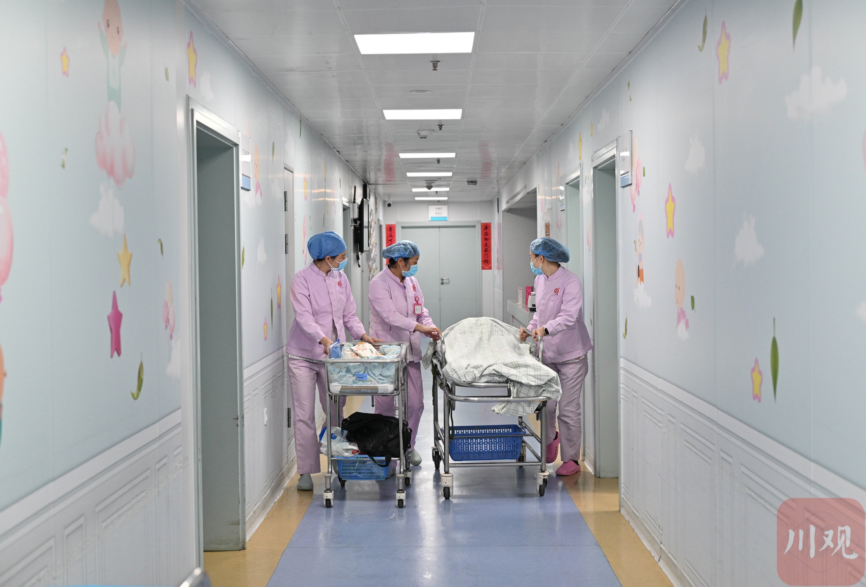 袁顺芳(中)和助产士们转送产妇和新生儿回病区。