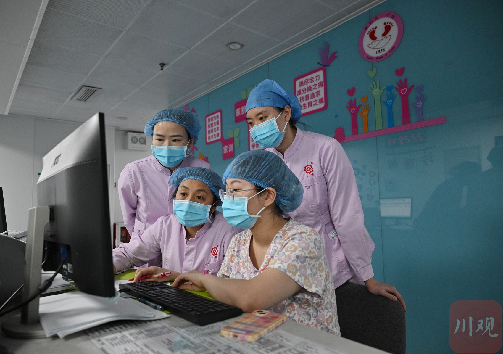 袁顺芳(左二)和共同值守的助产士们查看孕产妇记录。