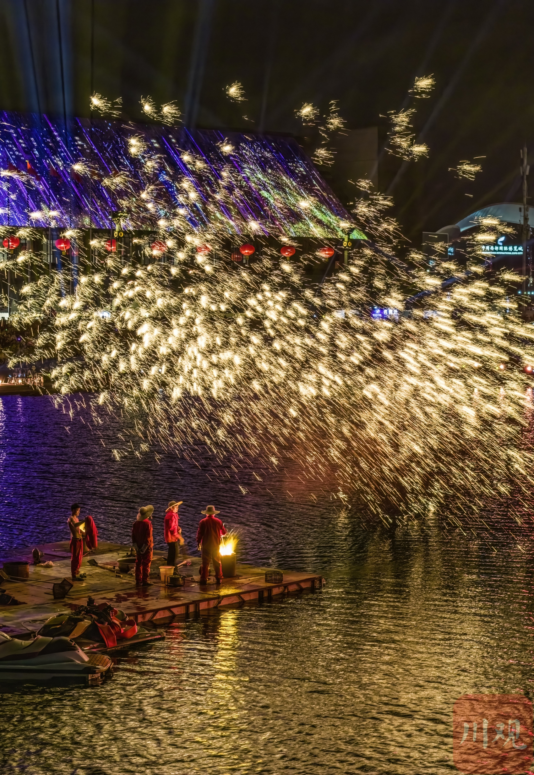 12月31日晚,天府新区天府大屋檐的夜空被灯火点亮,艺人在秦皇湖中表演“水上铁花”。