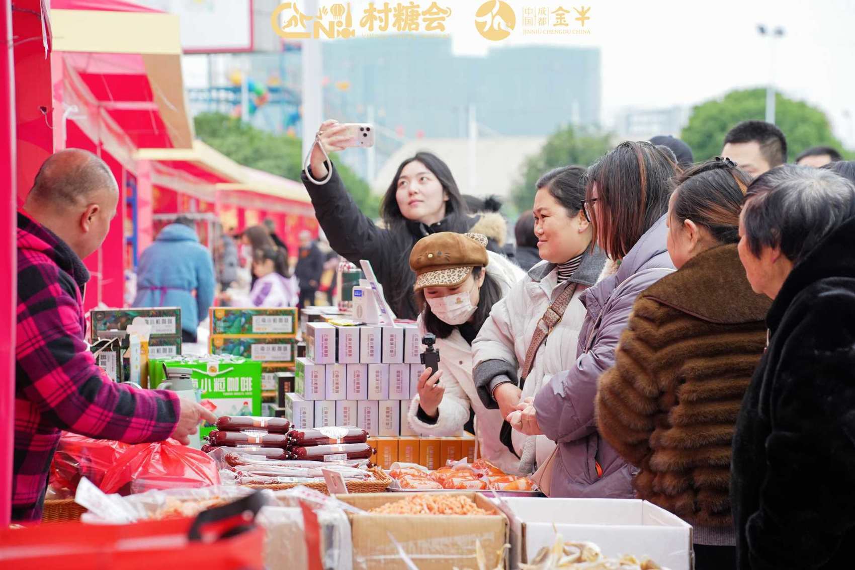 本次“村糖会”犹如一个巨大的“万物集”。主会场划分为年货展位、非遗展位、链主企业展位等多个功能区域,吃穿用度应有尽有,通过“摆展+试吃”“展示+体验”的多元形式,让市民沉浸式感受消费。活动打破区域壁垒,深化省内协同合作,石渠县、彭州市、什邡市、丹棱县、邛崃市五地携手带来牦牛肉、石渠白菌、川芎叶茶、什邡米粉等特色好物组团参展,打造“山海同心・好物共销”跨区域展示平台。