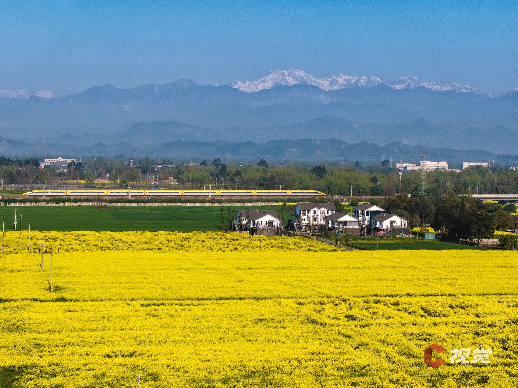 3月25日,一列动检列车CR400AF-J-0002驶过油菜花田的川西民居之间,远处的大雪塘雪山清晰可见。C视觉签约摄影师 安咏涛