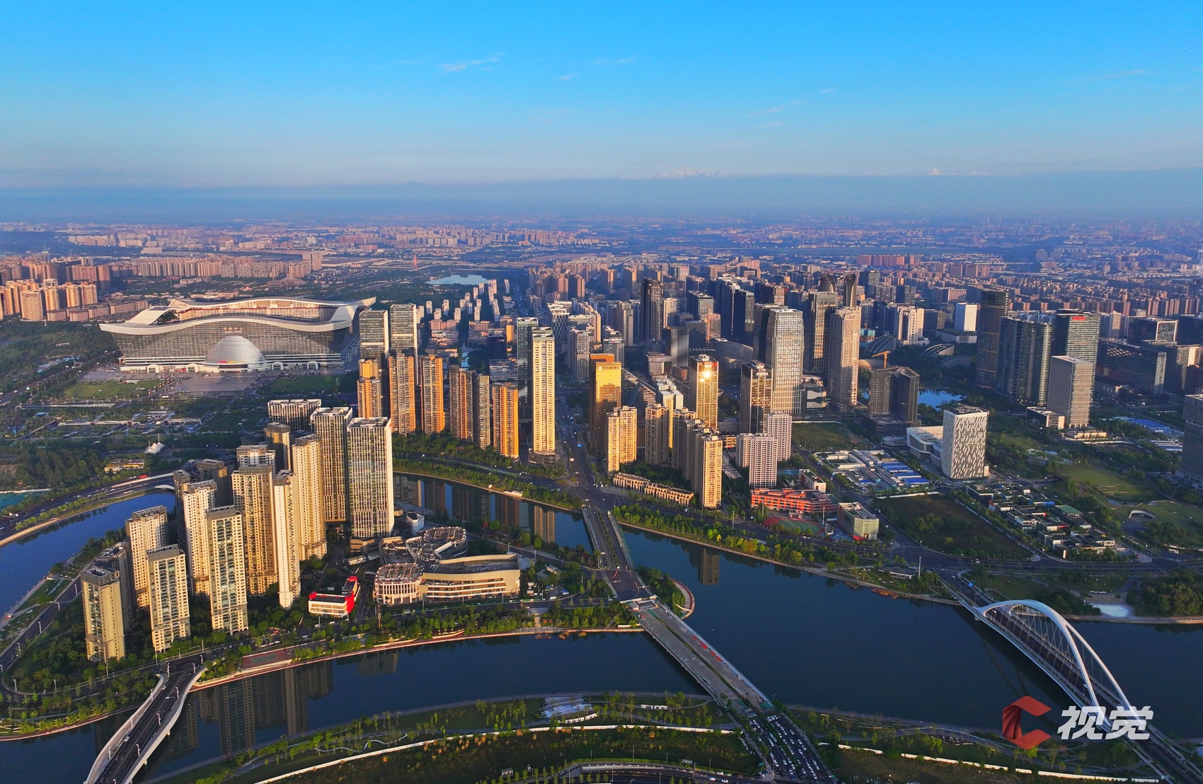 4月30日,高新区的写字楼群玻璃幕墙折射着流动的光轨,远处大雪塘与幺妹峰浮在靛蓝暮色中。C视觉签约摄影师 张翔升