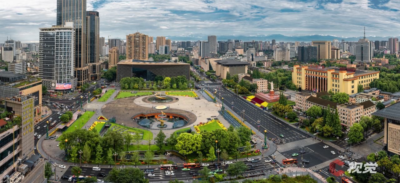 7月11日,在成都市中心天府广场,云端露头的幺妹峰与天边的流云共同勾勒出公园城市的美丽画卷。C视觉签约摄影师 杜森
