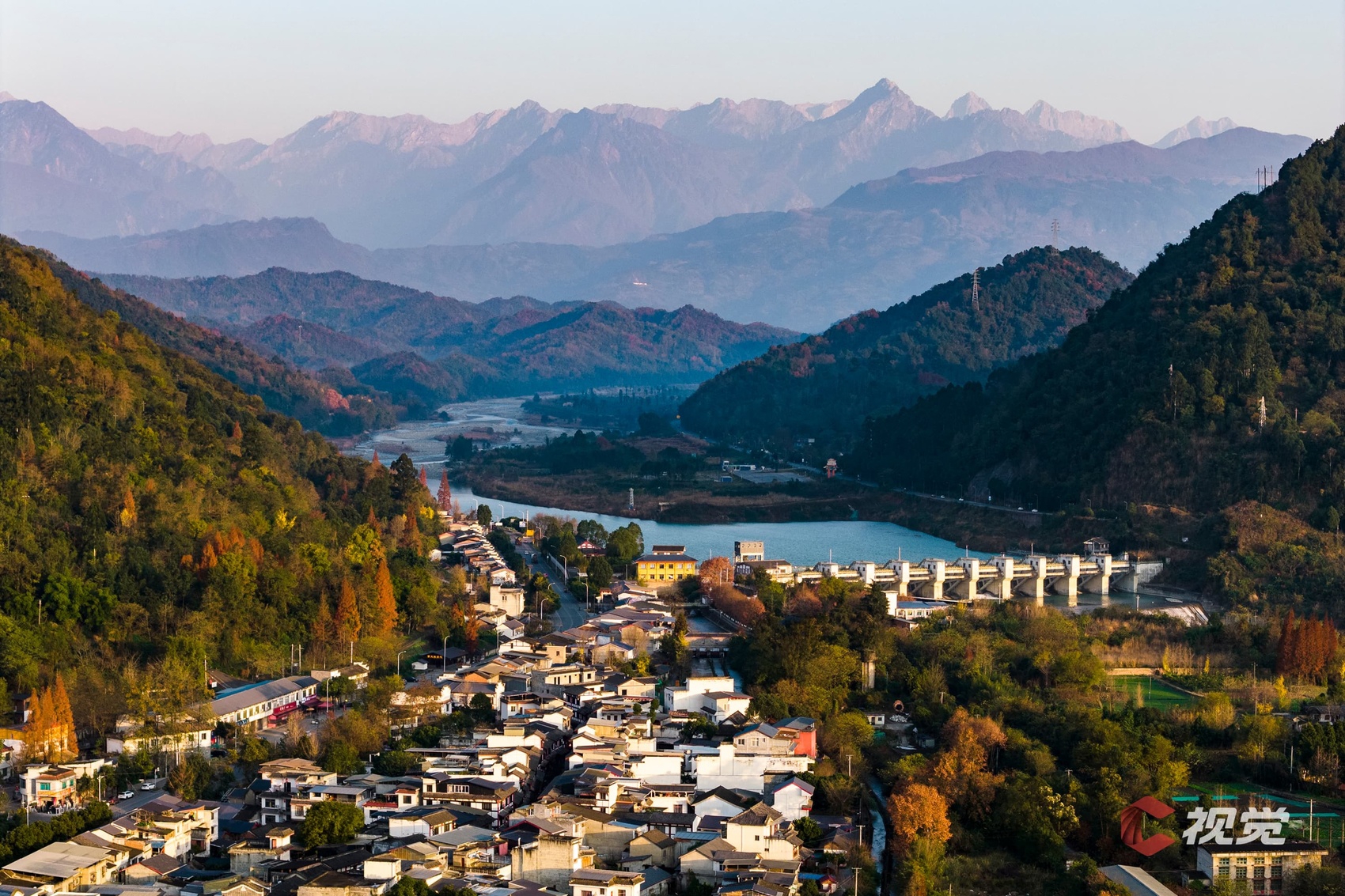 11月15日,在崇州白塔湖,彩林尽染的层叠山峦与远处若隐若现的雪山构成了一幅乡村美景画卷。C视觉签约摄影师 朱志宏