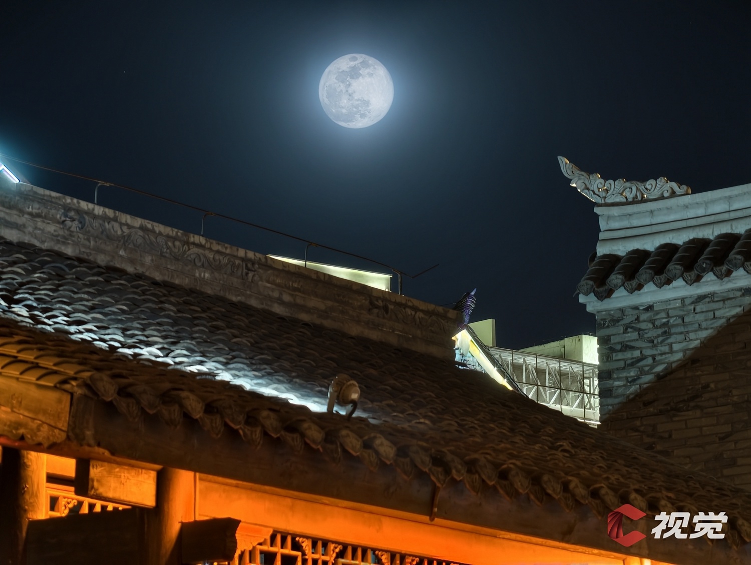 “超级月亮”与古城建筑交相辉映。