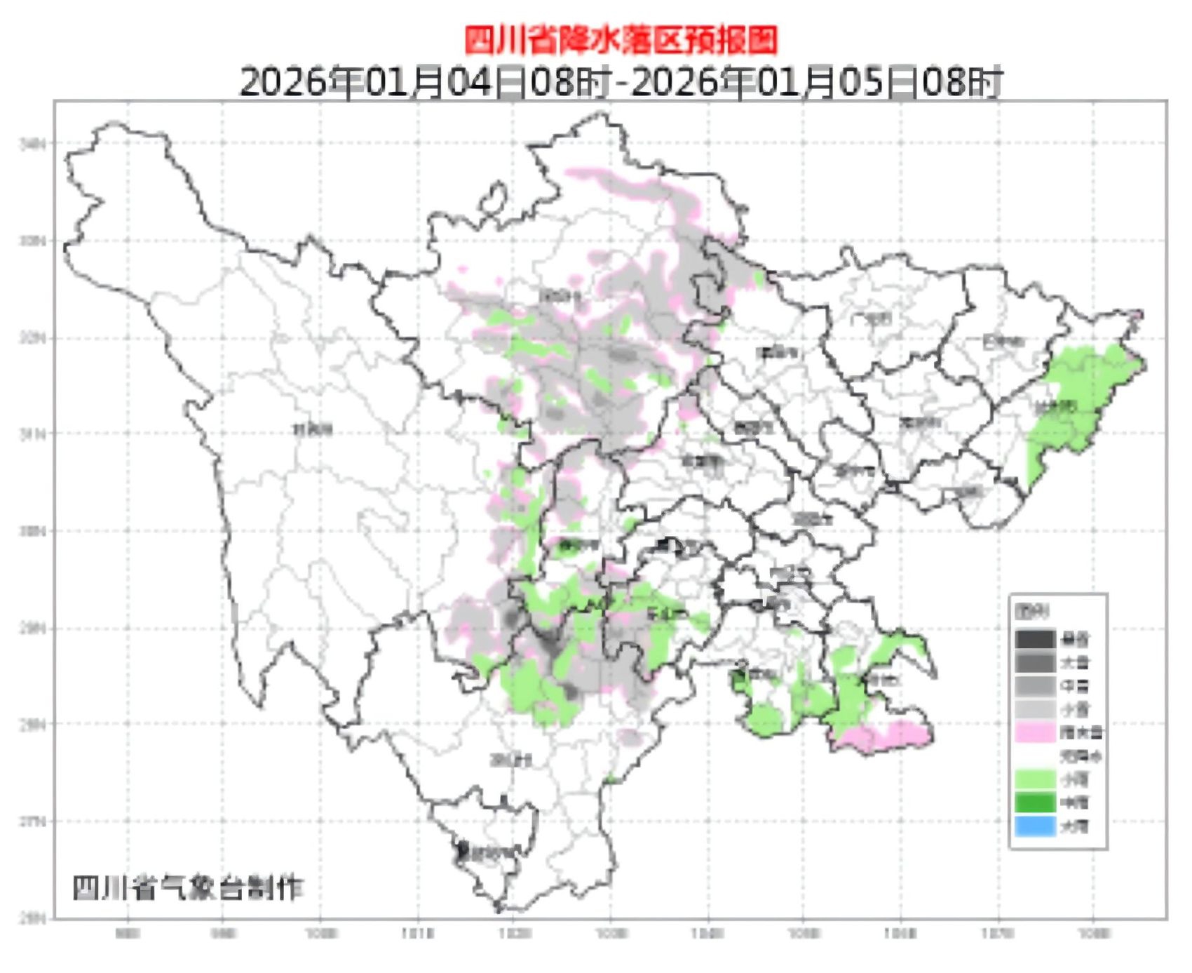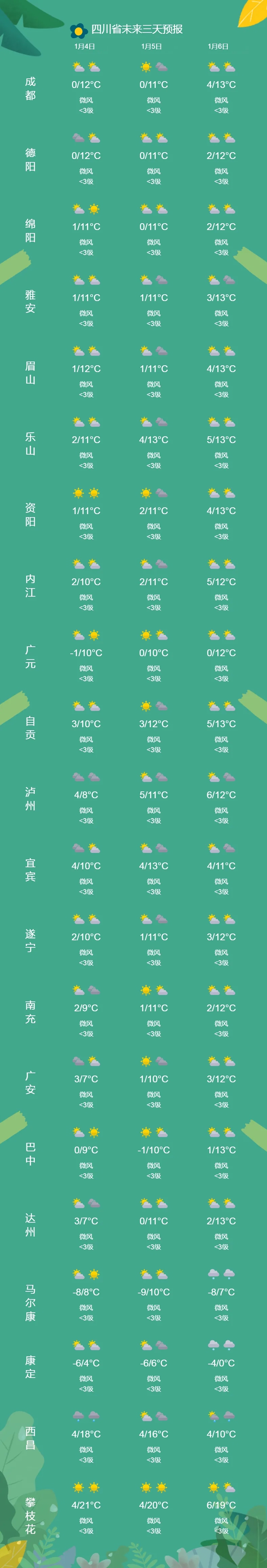 据四川省气象台预报,1月4日至10日,盆地以多云间晴天气为主;川西高原东部南部和凉山州北部多阵雪或阵雨,川西高原和攀西地区其余地方大部时段多云间晴。5日至7日,盆地西南部山区有小雨,高海拔地区有雨夹雪;川西高原东部南部和凉山州北部有阵雪或阵雨,局部中雪。