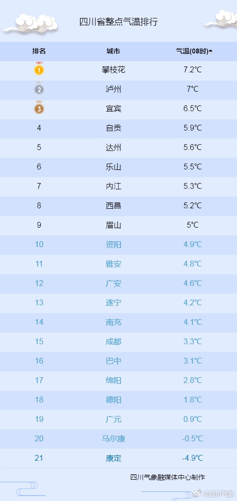 实况监测显示,今天8时,四川全省最高气温为7.2℃(攀枝花),盆地最低气温仅0.9℃(广元)。
