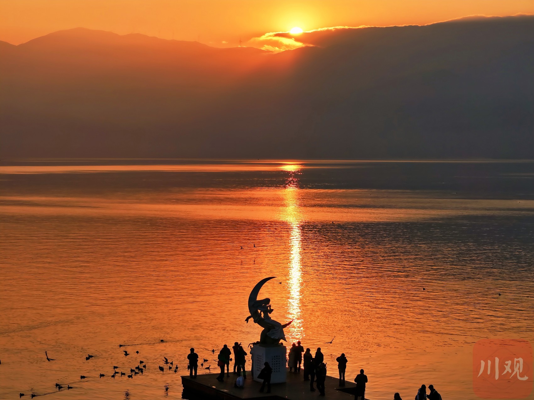 新年第一天,游客在邛海朝阳中与自由飞翔的海鸥同框,构成一幅温暖浪漫的冬游四川画卷。