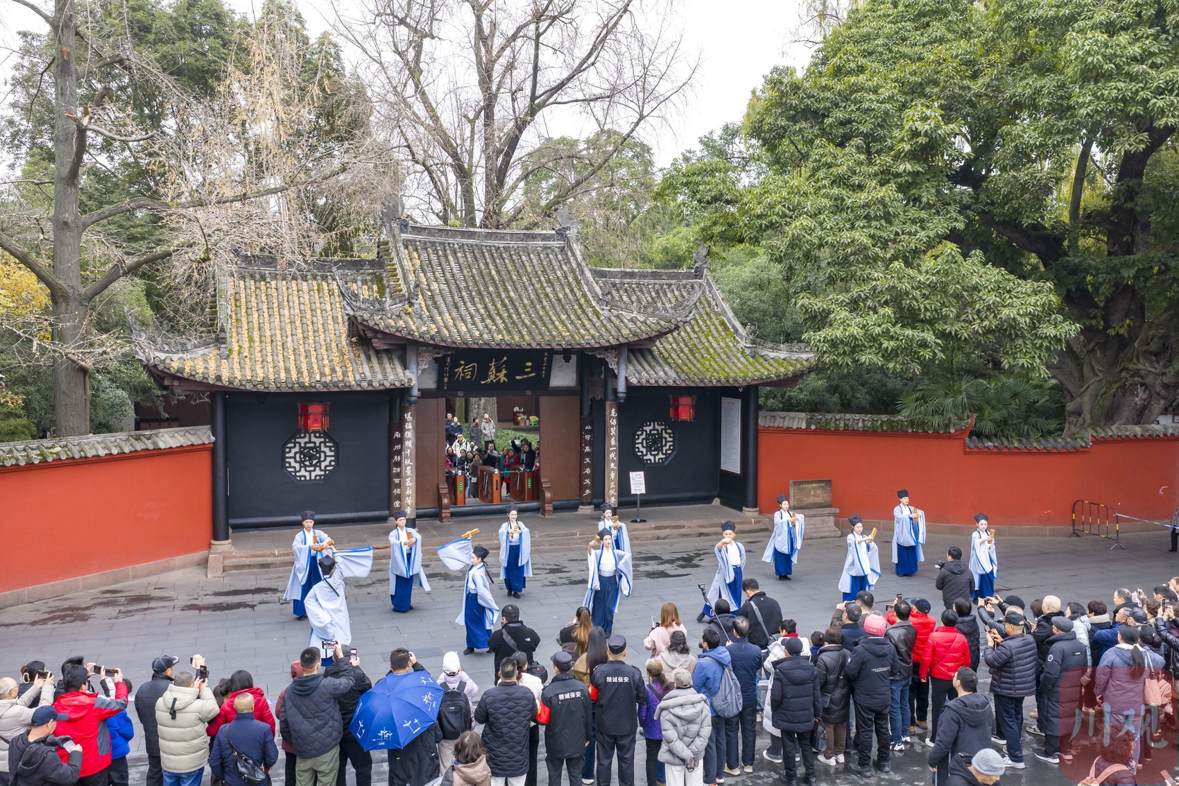 1月1日,眉山三苏祠南门前上演《进士出眉州》文化快闪,生动表演活化历史场景,让游客沉浸式体验三苏文化。