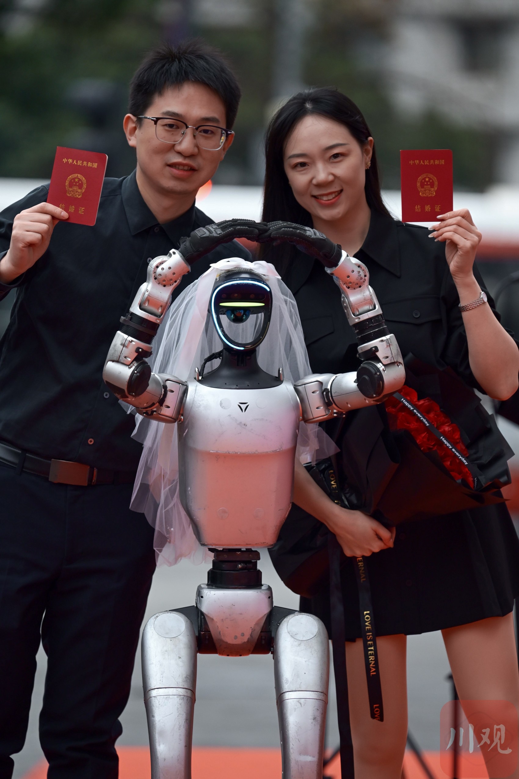 1月1日,100余对新人在成都市合江亭婚姻登记处登记领证。镋钯机器人戴上头纱,化身“智能送福官”与新人互动,成为新年的幸福瞬间。