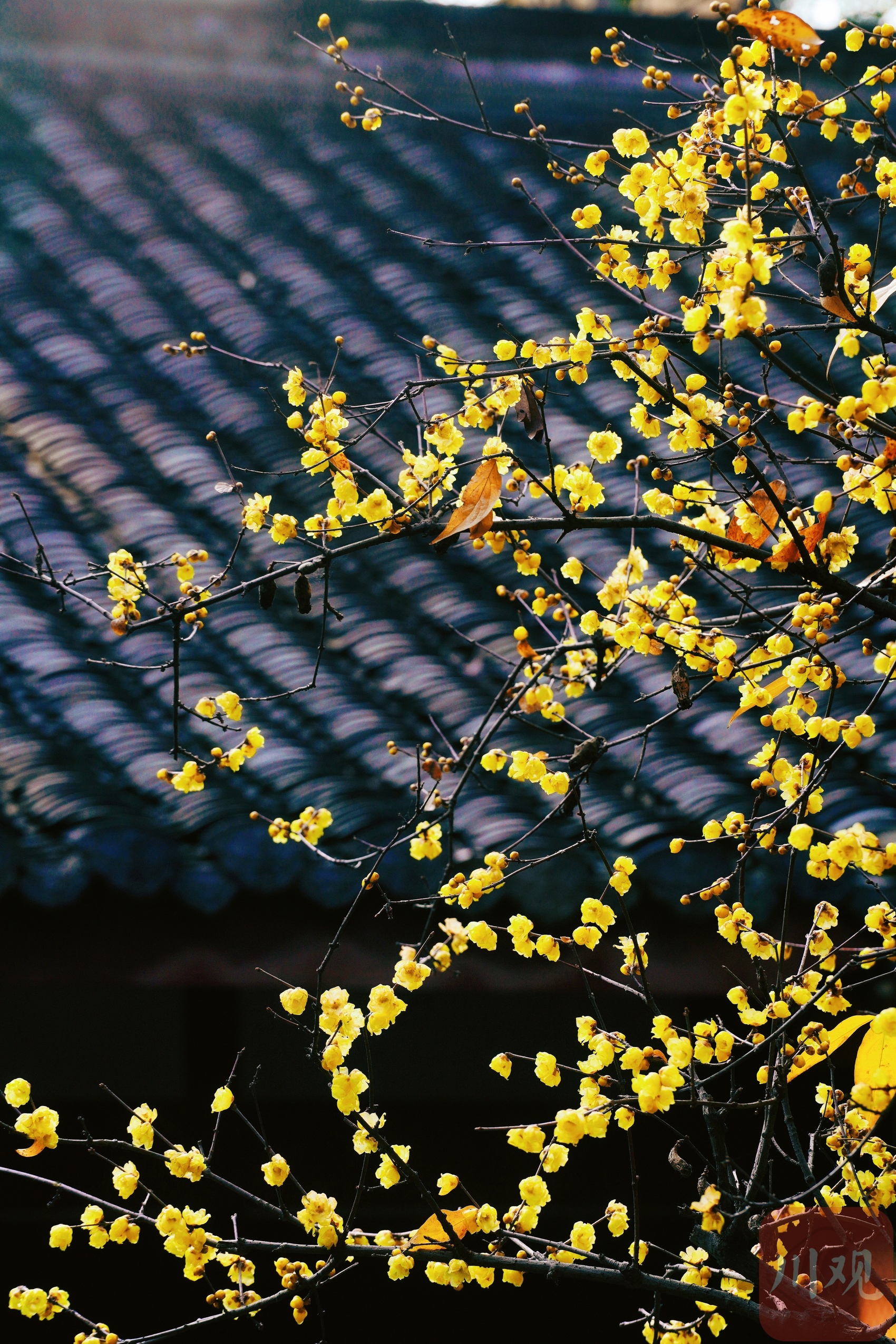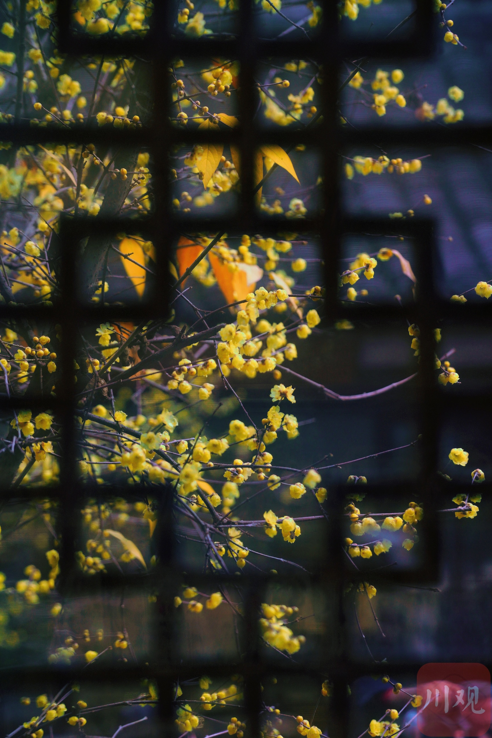 三脚架在蜡梅树下林立,长焦镜头对准枝头蜜蜡色花朵,杜甫草堂里摄影爱好者们屏息凝神,等待阳光穿过半透明花瓣的瞬间——成都的冬日限定“金色蜡梅”盛宴已然开幕。