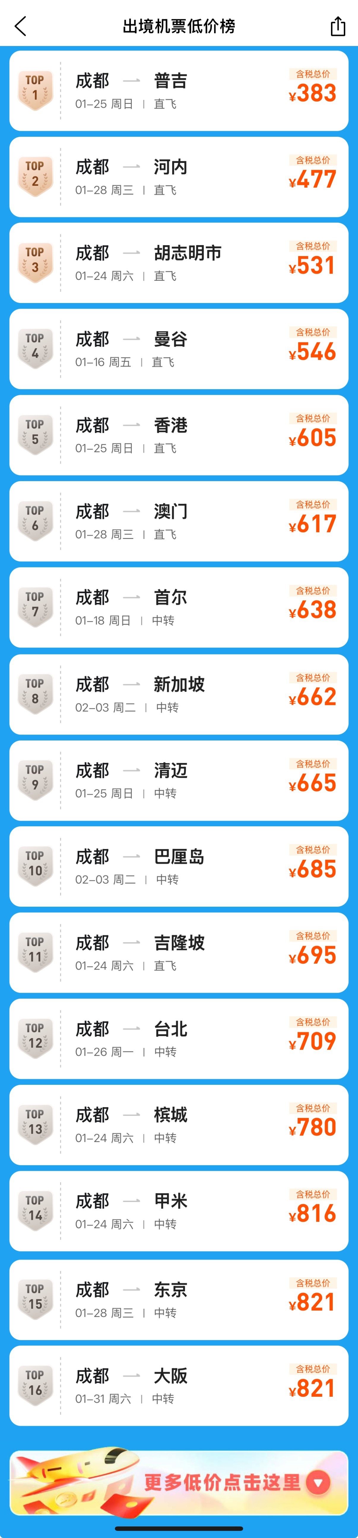 出境方面,从成都到普吉最低价格383元,成为目前的性价比之王;到河内、胡志明市、曼谷等地,机票最低价格在500元左右,且时间集中在1月下旬。除此以外,从成都直飞中国香港、澳门最低机票价格在600元左右。