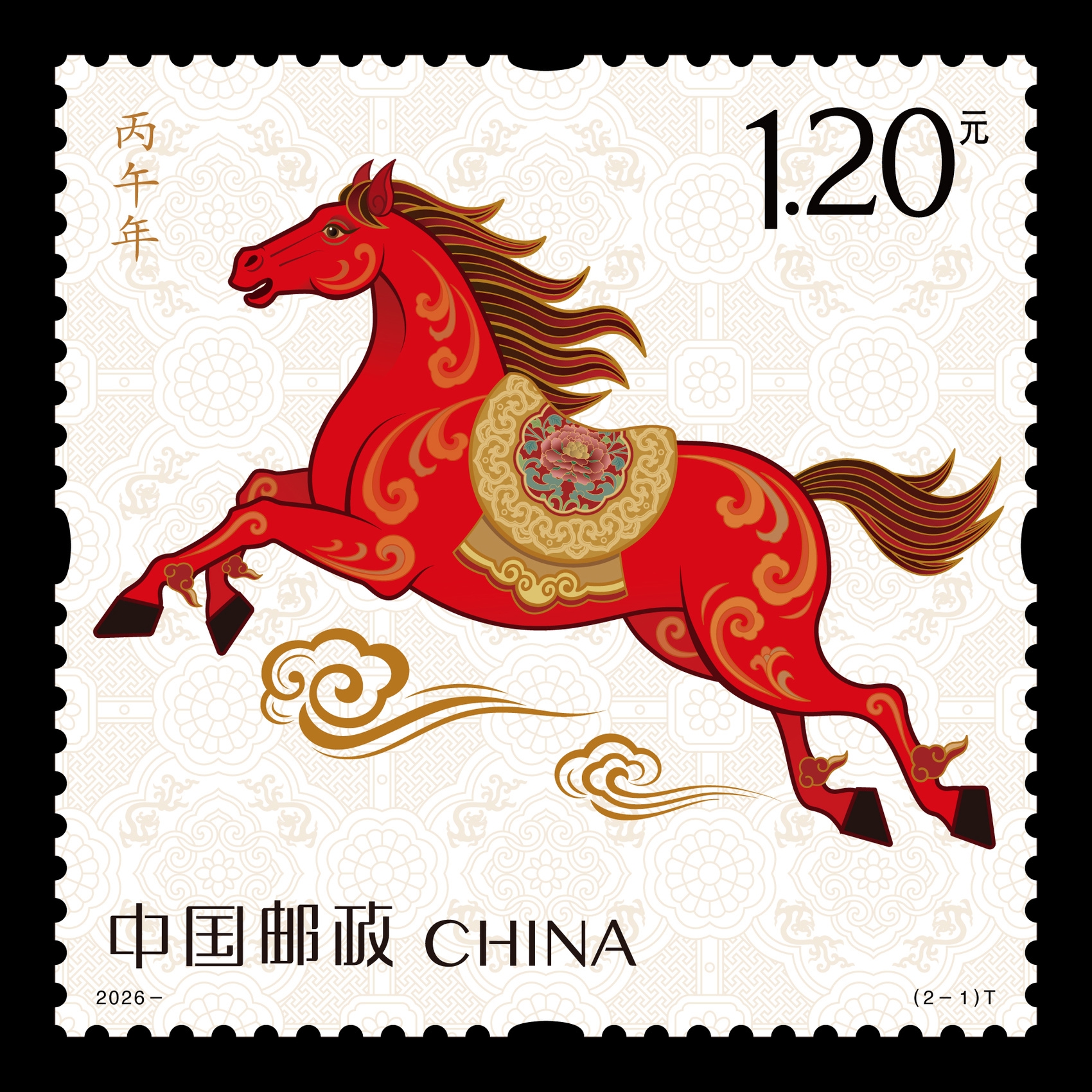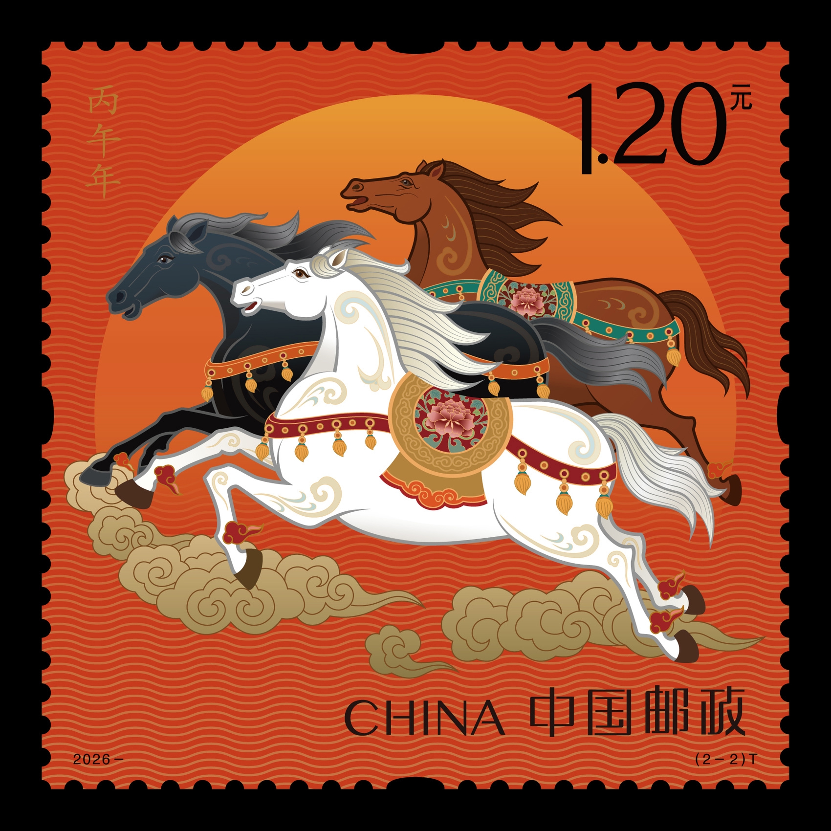 《丙午年》特种邮票由王红卫、赵恩重设计。邮票一套两枚,第一枚图名为“驰跃宏图”,以“腾跃新时代”为核心意象,展现了一匹红马奔驰于祥云之上,鬃毛如焰,四蹄生风。