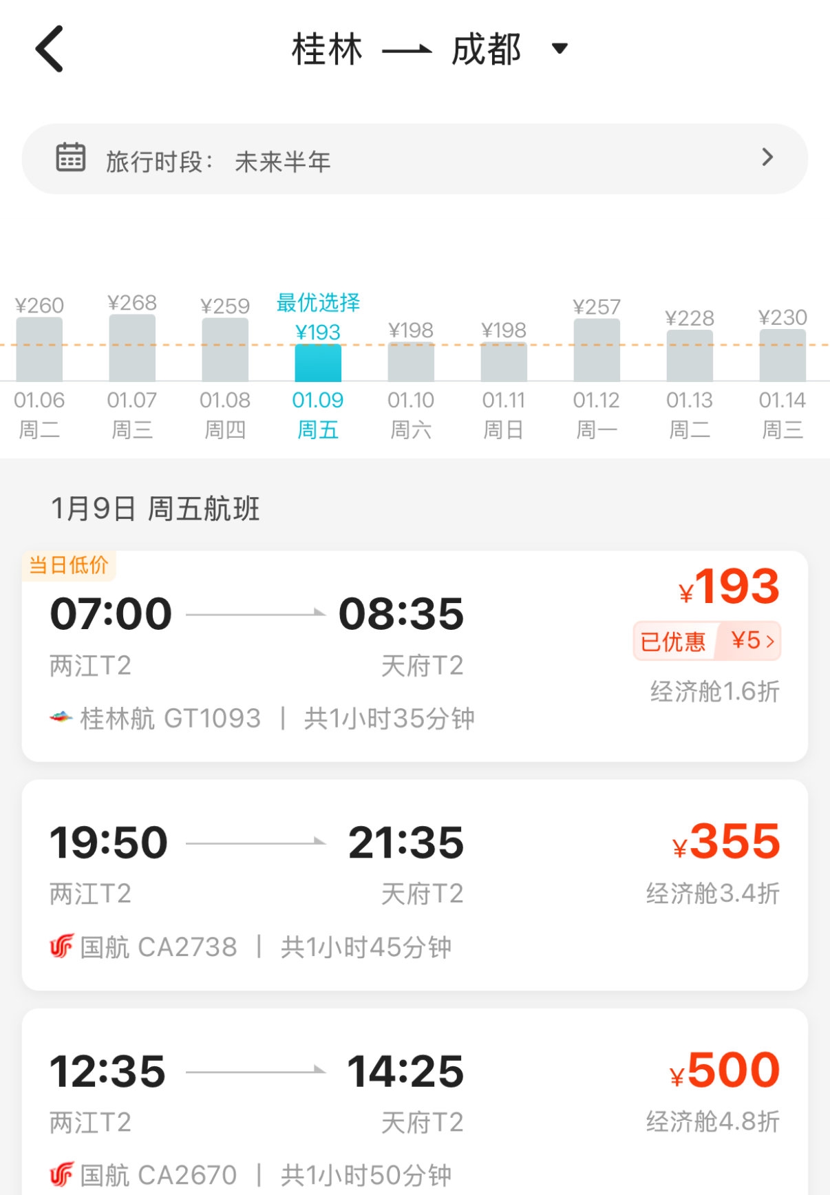 1月5日18时查询的桂林至成都的低价机票。