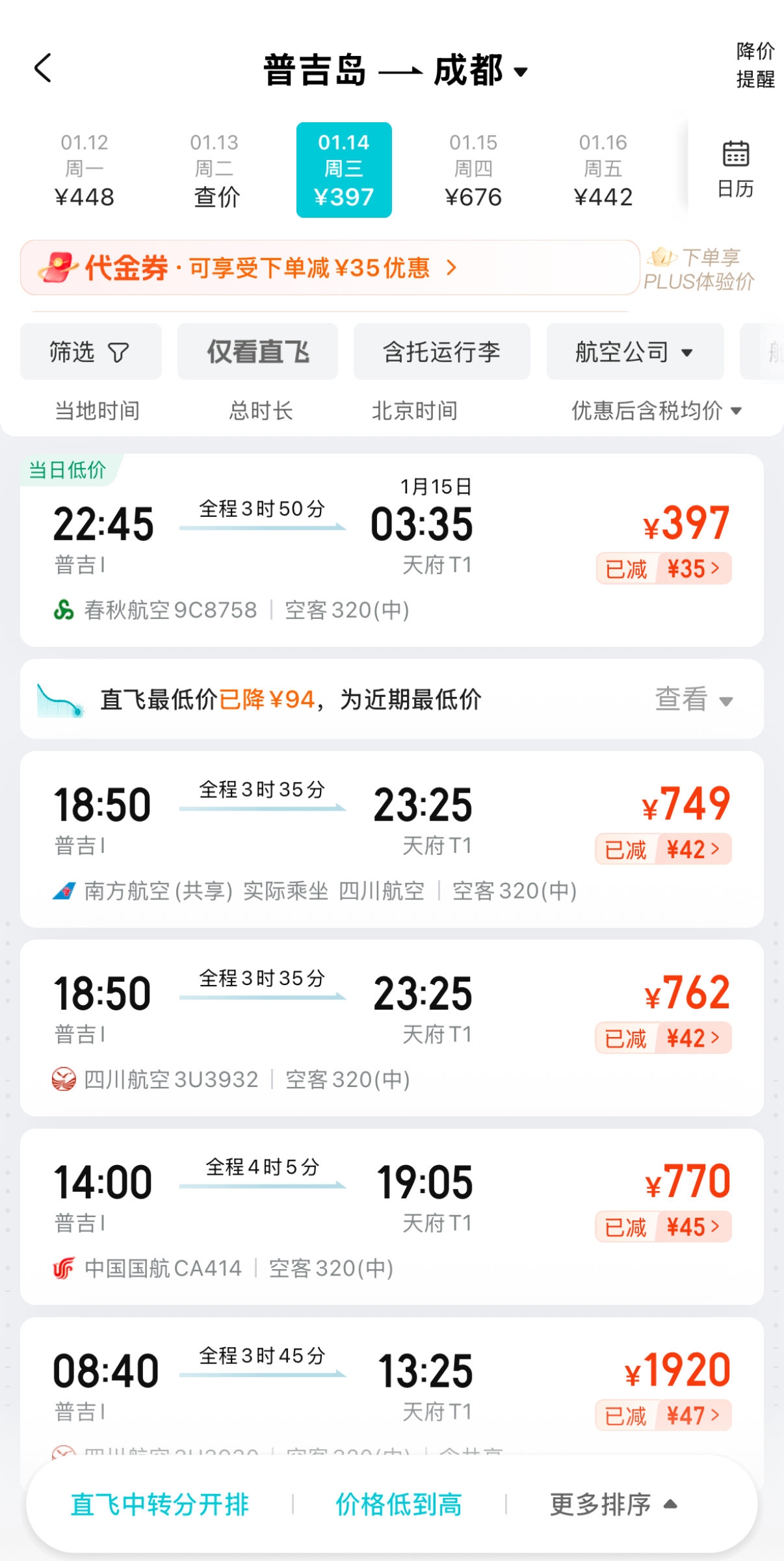 1月5日18时查询的普吉岛至成都的低价机票。