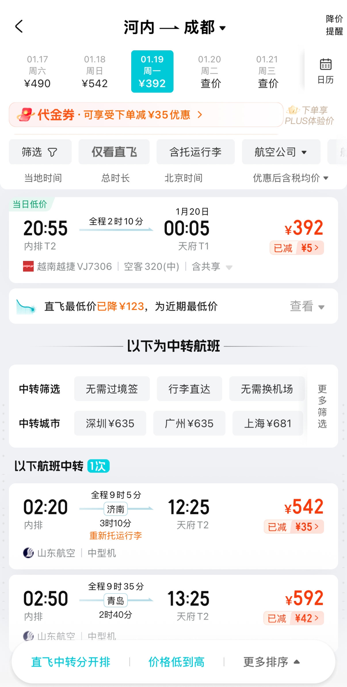 1月5日18时查询的河内至成都的低价机票。