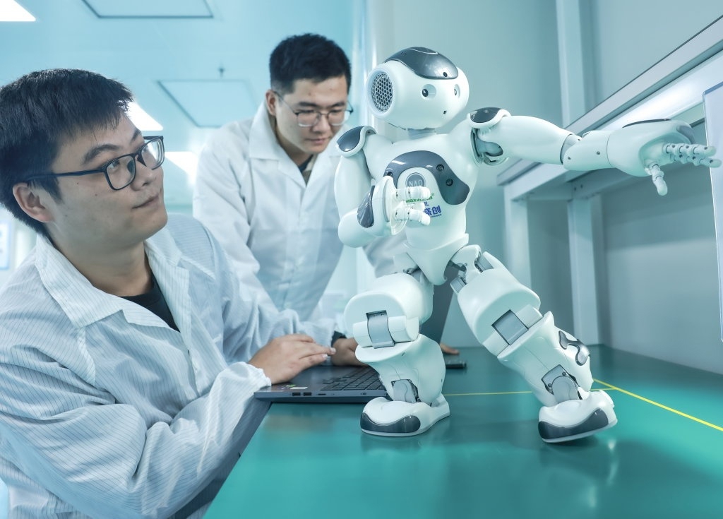 1月5日,在盛视科技股份公司华中总部武汉研发中心,技术人员在调试人形机器人。