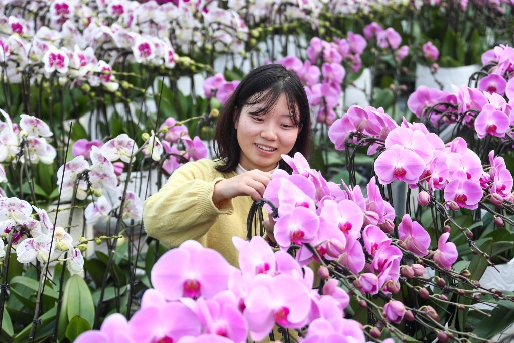 1月5日,花农在江苏省句容市茅山镇前陵村蝴蝶兰种植基地管护花卉。