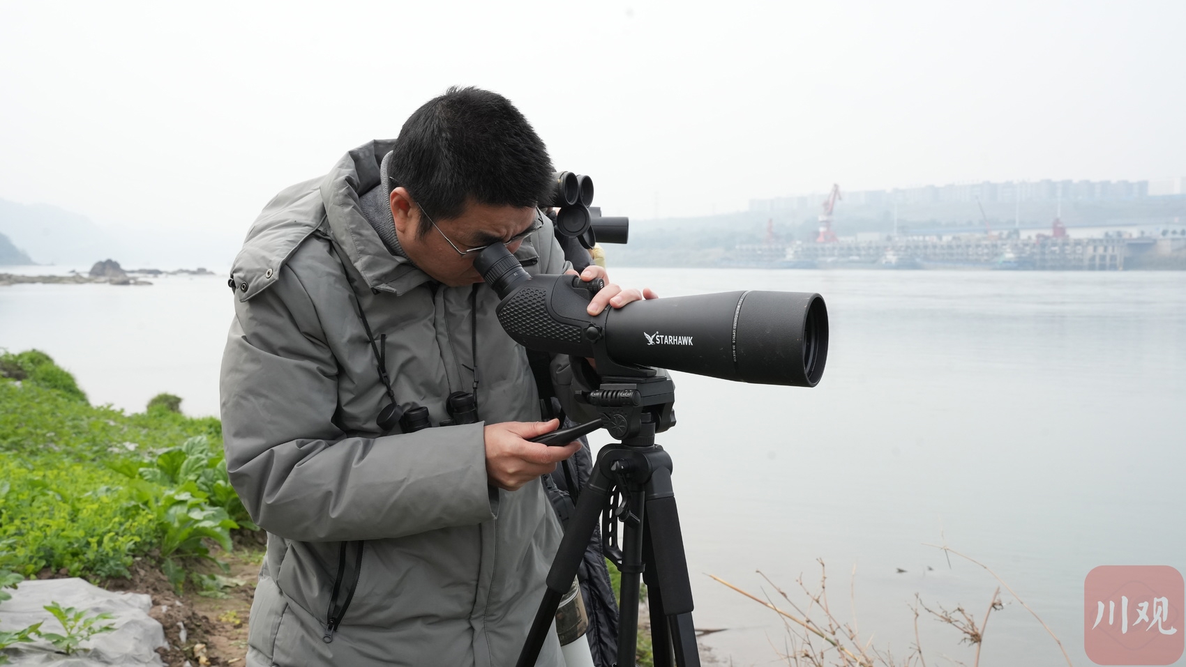 在外行眼中,远处水面上或许只是模糊移动的“一群野鸭子”。如何既辨种类又计数量?彭浩展示了他们的专业“武器库”:脖子上挂的双筒望远镜负责快速扫描江面,锁定鸟群方位;三脚架上稳当架设的高倍单筒望远镜,则用于拉近细观,用于辨认种类和清点数目;斜挎的长焦相机随时准备捕捉物种清晰影像;手机中的轨迹记录App,则记录下物种现身的位置。