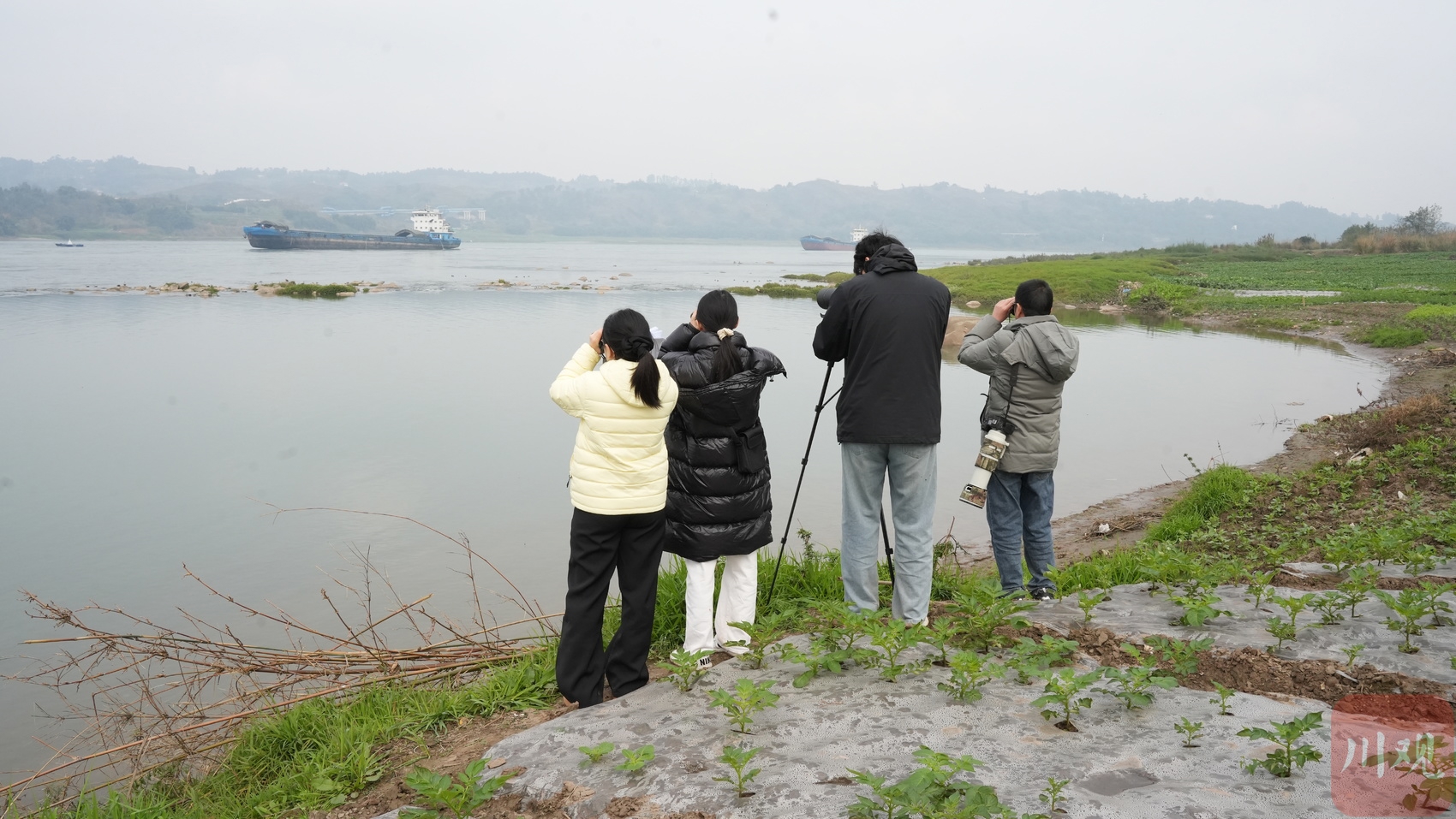 监测团队在长江边进行越冬水鸟监测。