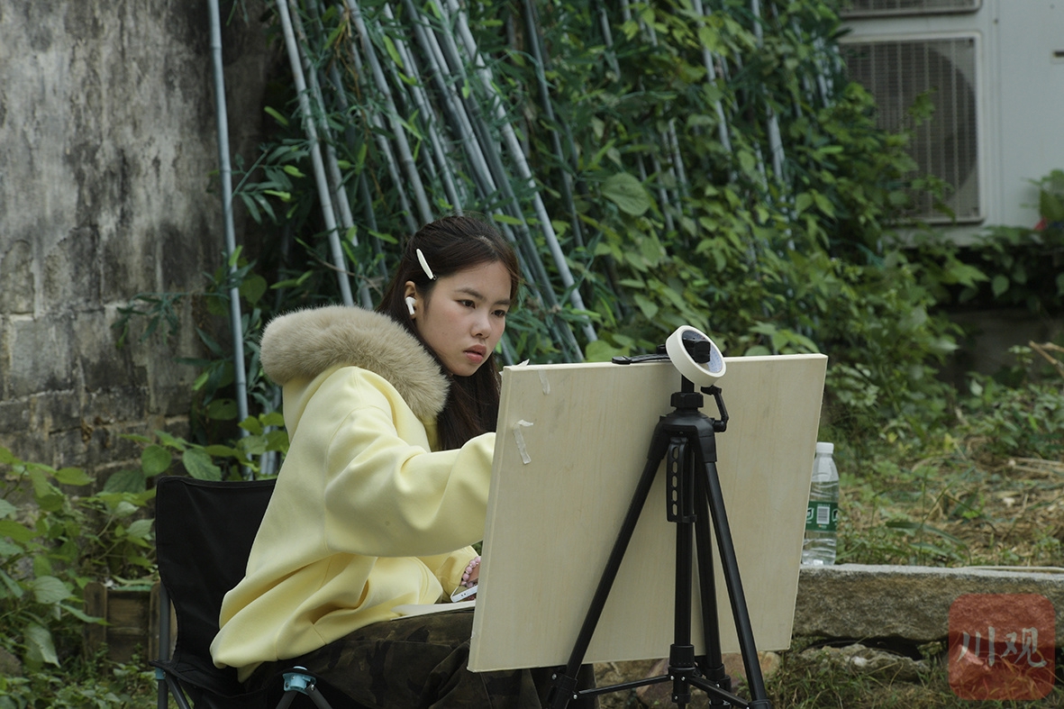 绿植环绕的户外一隅,美术学院的女生正在专注写生。