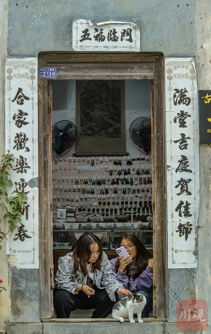 古铺门前,姑娘们逗猫闲坐,老巷烟火漫染时光。