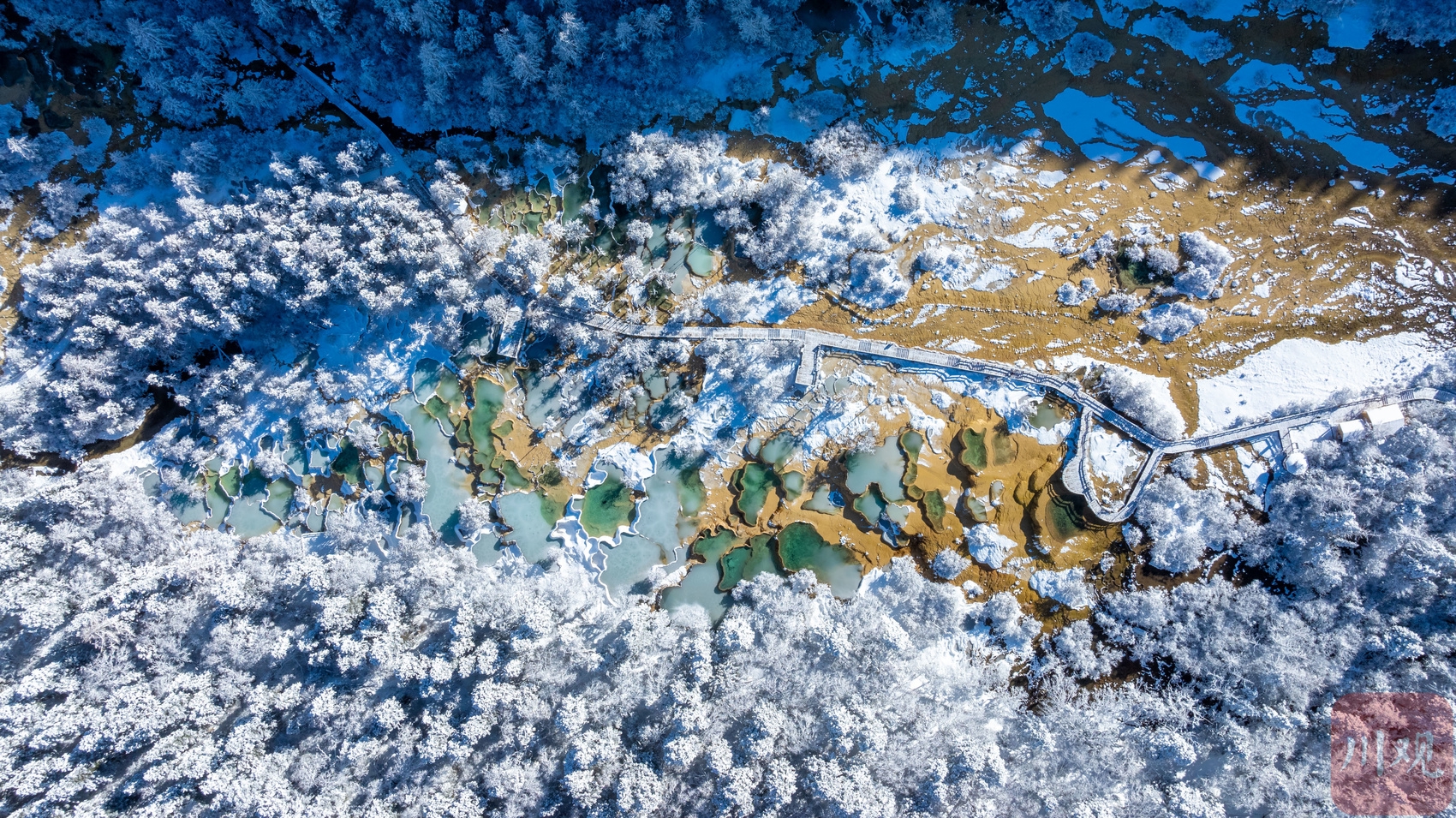 1月6日,雪后的黄龙景区,蓝绿、明黄、浅白等颜色相互交织,仿佛是大自然的调色盘。