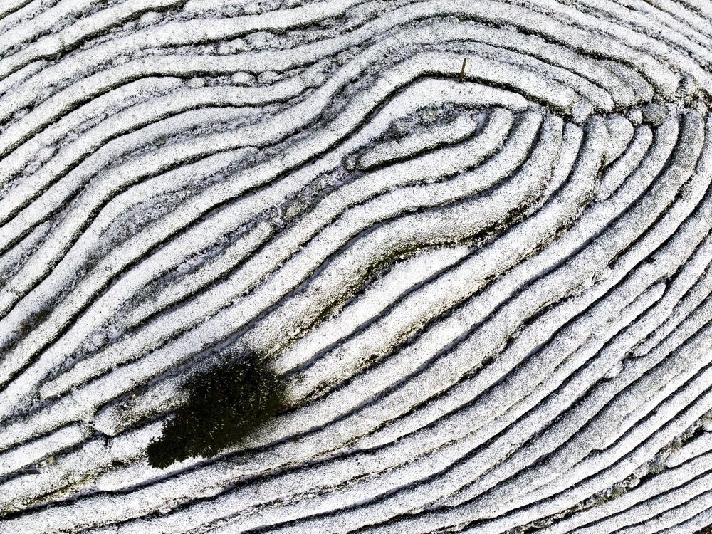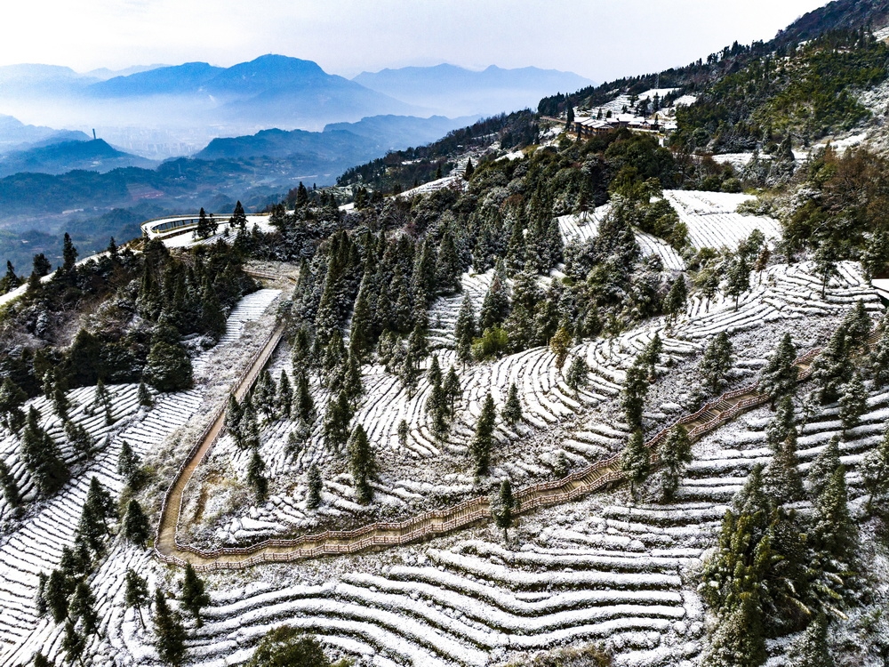 1月6日清晨,位于雅安市名山区的千年茶山蒙顶山被初雪覆盖。纷飞的雪花中,深绿的茶树枝叶“捧起”晶莹的冰渣,大地指纹般层层叠叠的茶山,盖上了一层层雪白的丝绒。