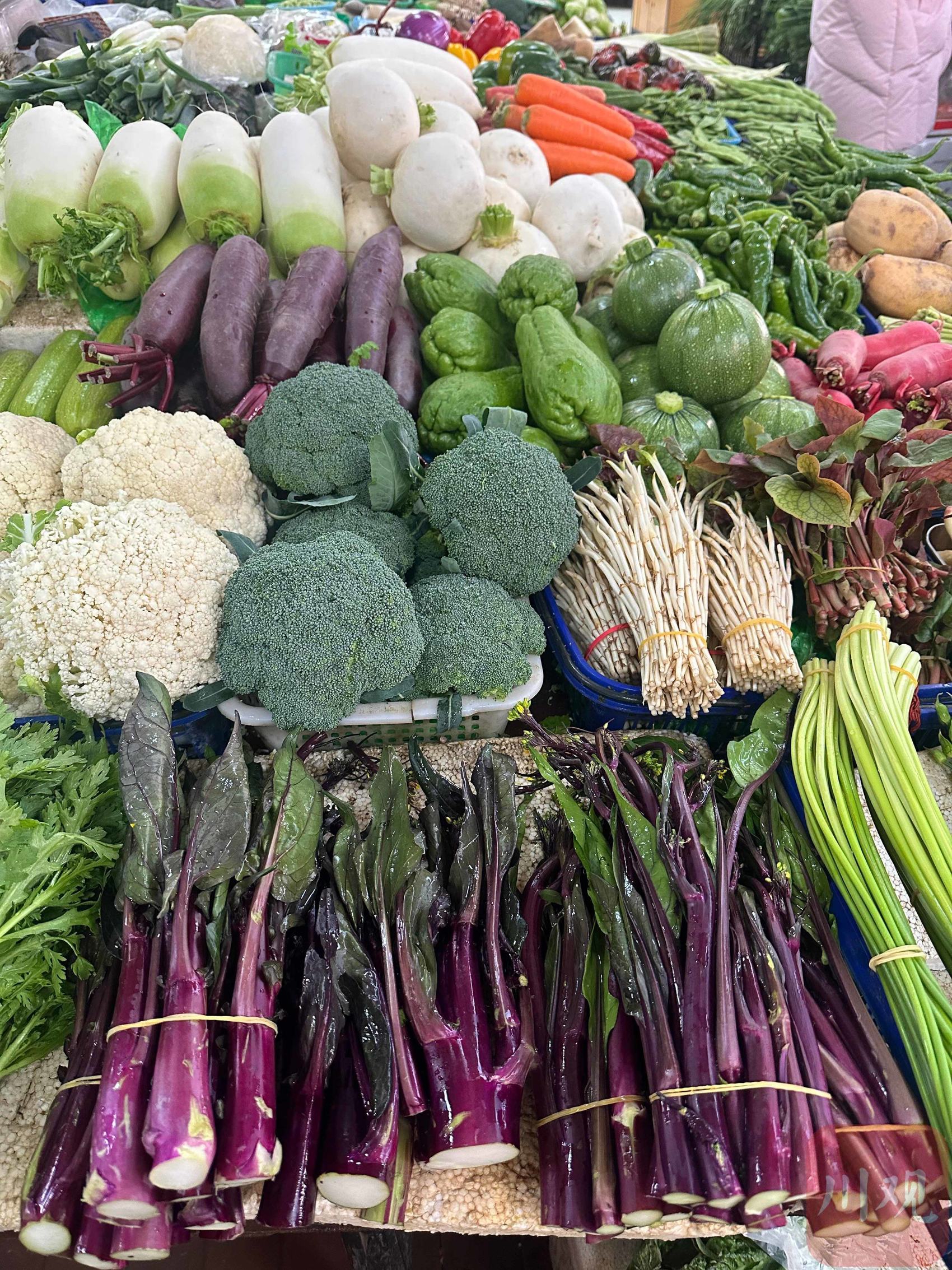 “来来来!霜打红菜薹5元一斤,霜打白萝卜2元一斤……”上午9点,成都青羊区贝森农贸市场里熙熙攘攘。放眼望去,几乎每个蔬菜摊都摆着一摞摞霜打菜,围满了选购的市民。