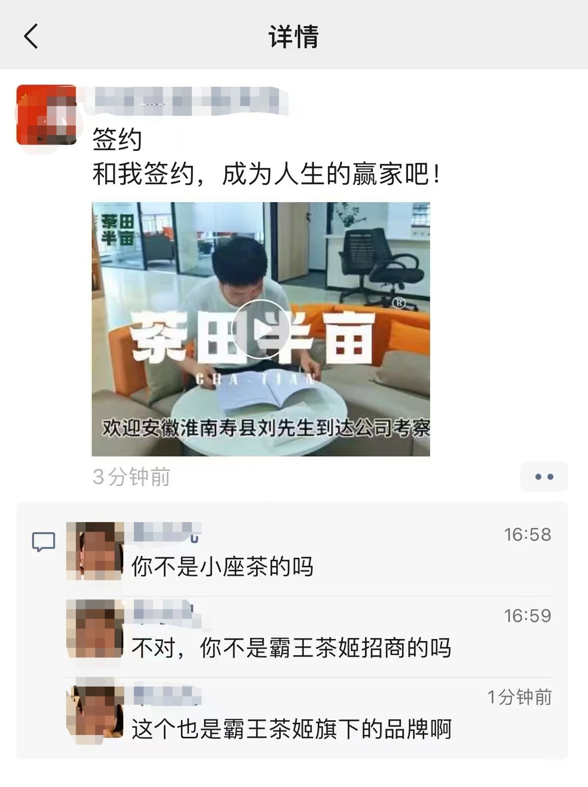交流中,这名男子告诉他,“霸王茶姬”加盟门槛高,且已经趋于饱和,诱导他加盟旗下另一款“子品牌”。