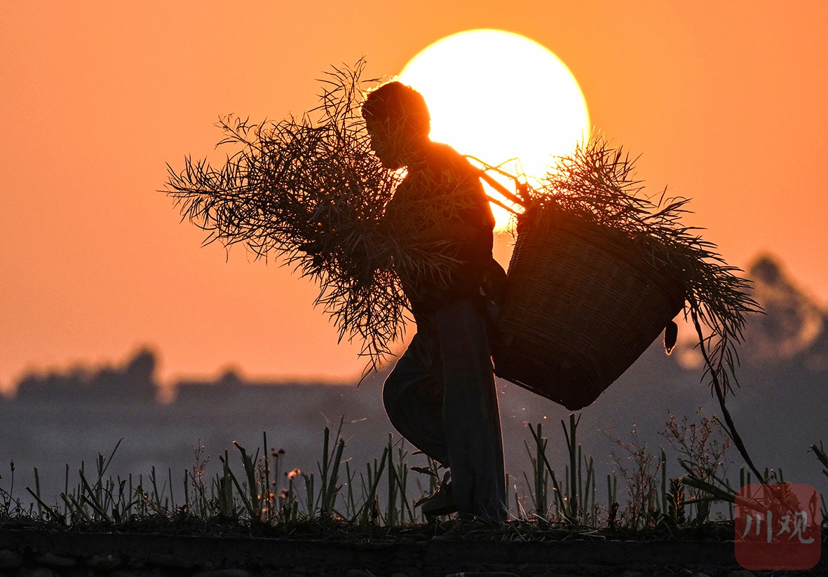 德阳市旌阳区东湖镇宝塔村,村民如托日行者,肩扛收获、身披朝霞前行。