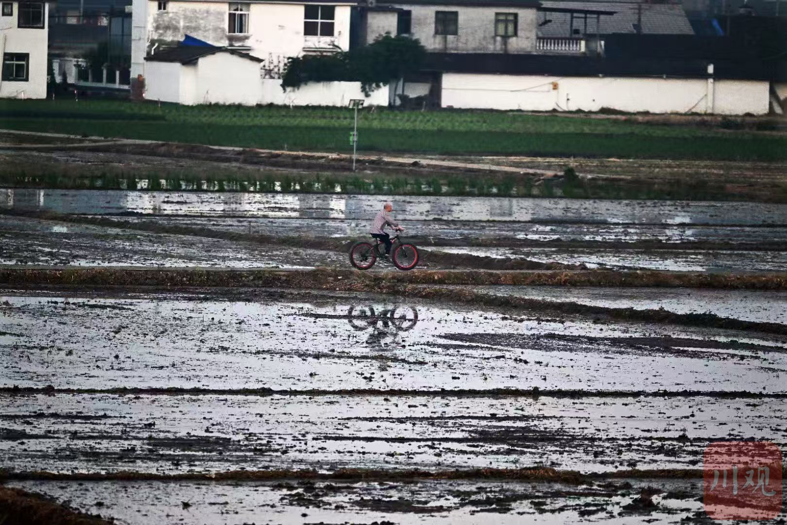 水田埂上,骑行的身影掠过泛着水光的田畴,车轮碾过的,是乡野里最舒展的日常节奏。