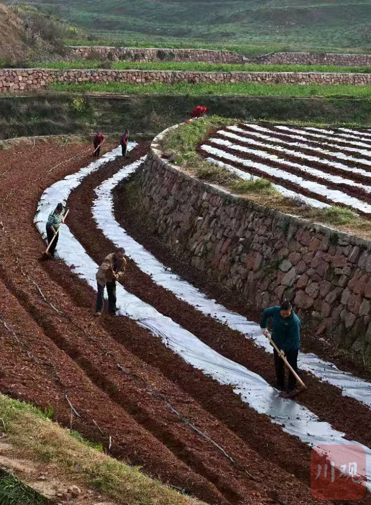 梯田里,农人们弯腰铺膜耕作,红白相间的田垄间,每一铲泥土都藏着春耕的盼头。