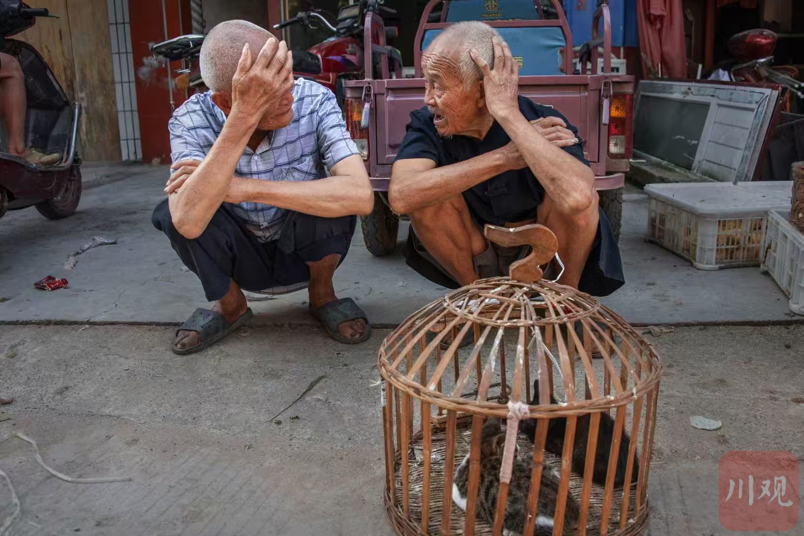 巷口蹲坐的两位老人,对着笼中猫闲聊,皱纹里裹着的,是市井日常里最松弛的烟火气。