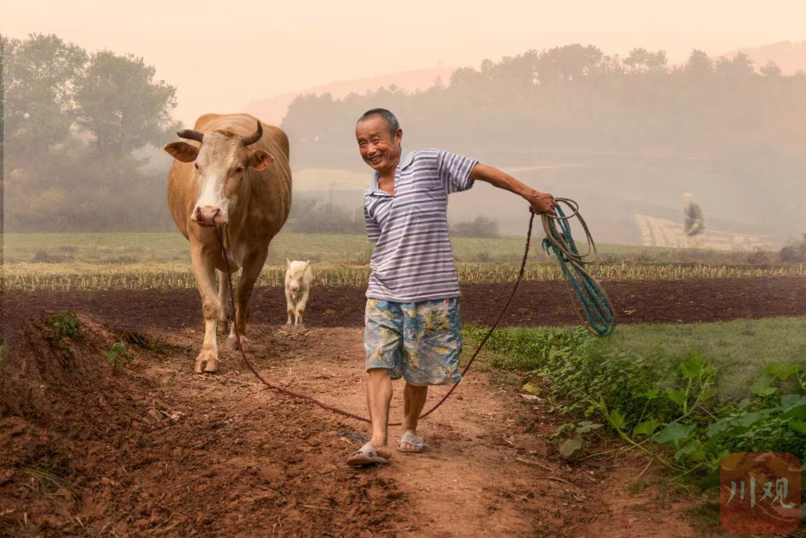 乡野土径间,老农牵着牛、身后跟着小羊,笑纹里裹着的,是田园生活里最踏实的暖。