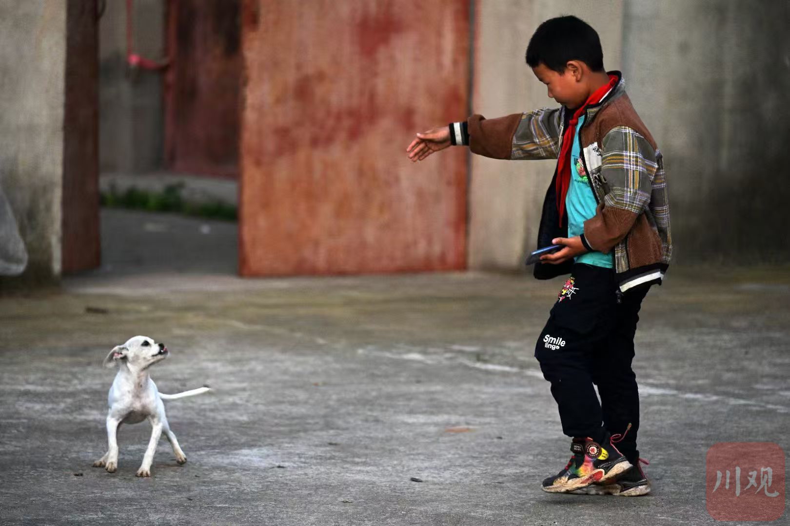 农家小院前,少年抬臂逗着仰头的小狗,这一唤一扑的灵动,是童年里最松弛的小热闹。