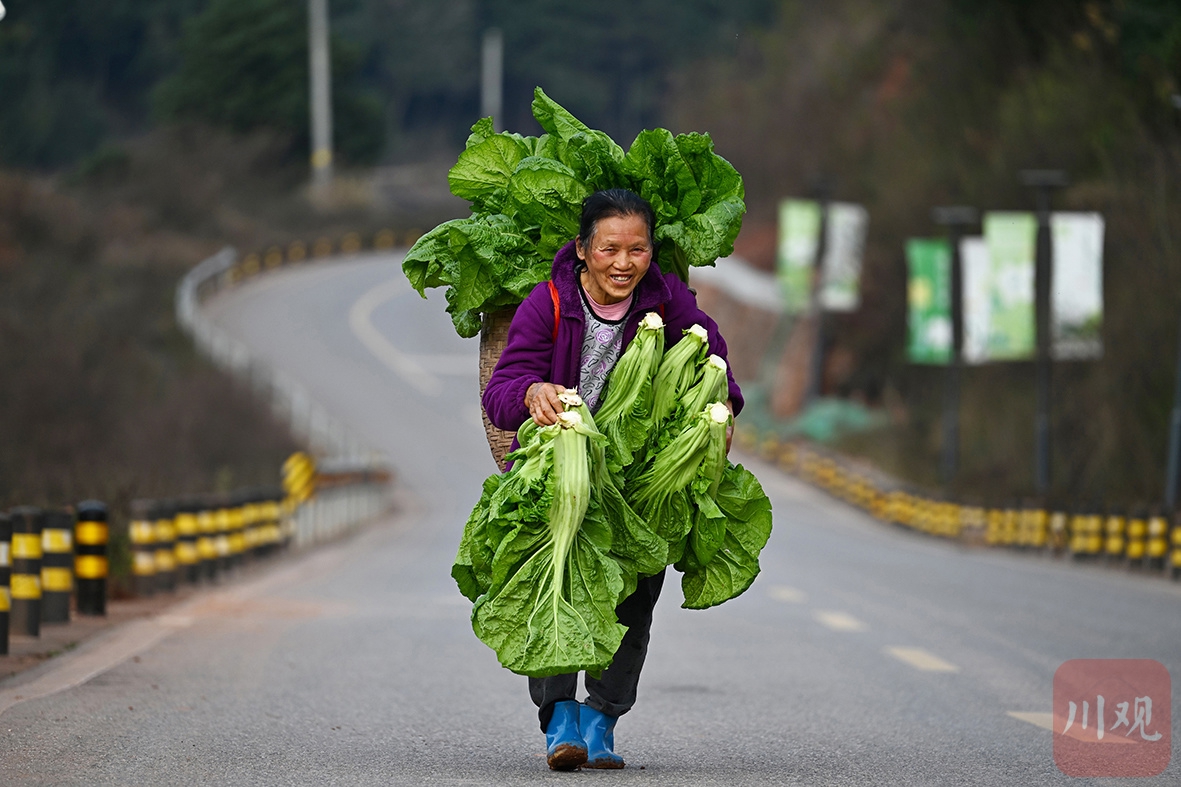 德阳市旌阳区双东镇尖山村,张大婶背着满满一筐青菜,笑容满面地走在回家路上。