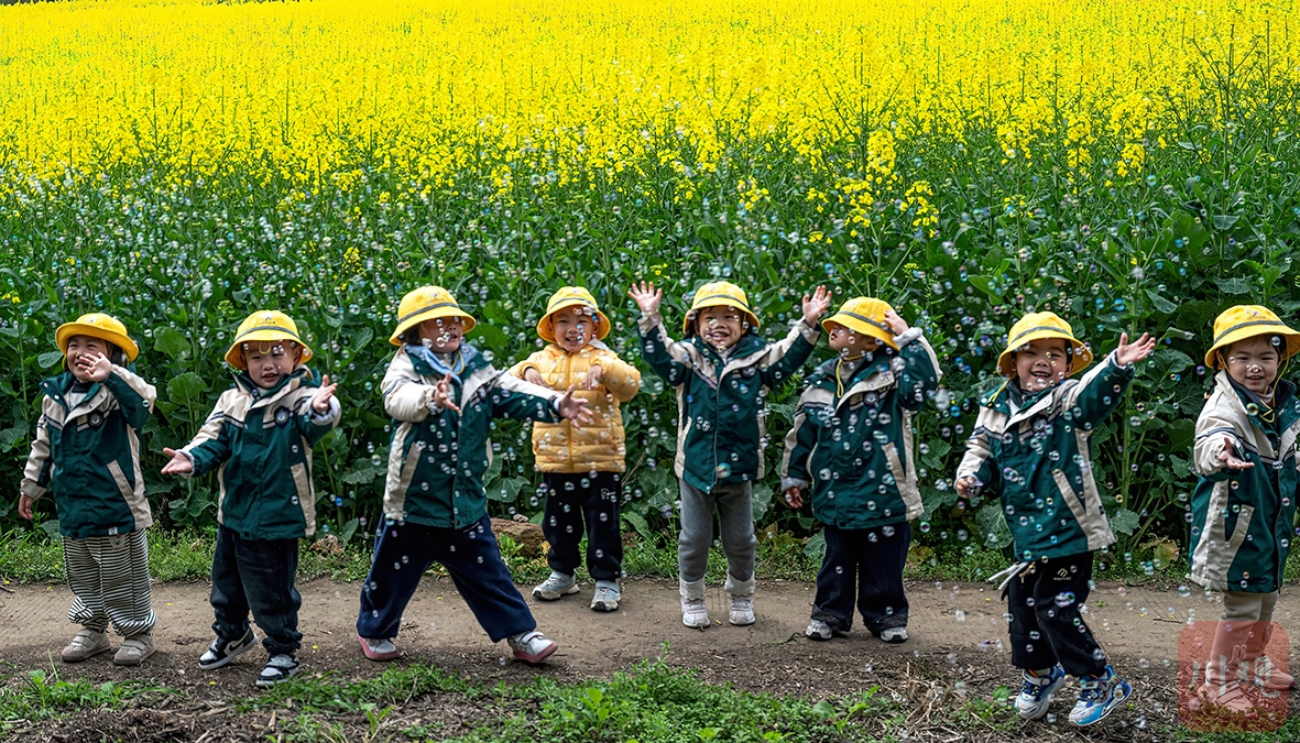 油菜花田边,孩童们尽情嬉戏,在烂漫花海里释放着童真与活力。