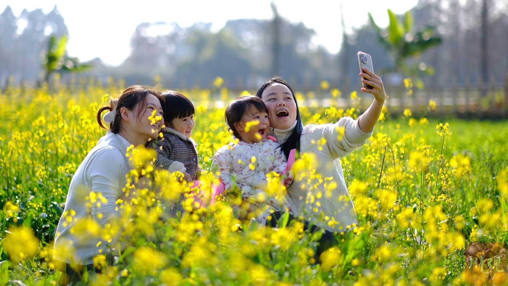 成都市郫都区早花油菜田内,市民带着孩子在金黄花海里自拍留影。