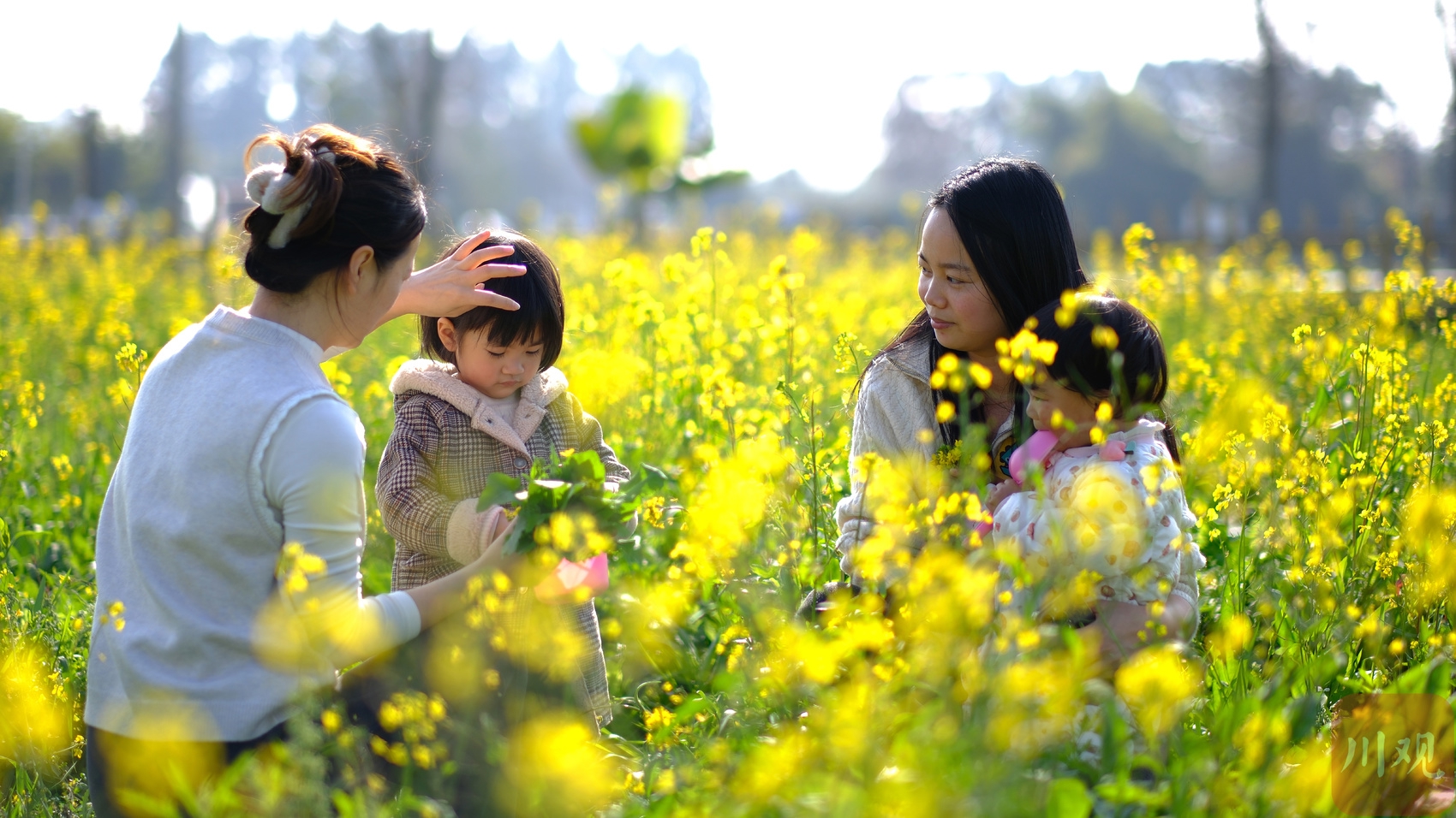 成都市郫都区早花油菜田内,家长带着孩子在花海中游玩。