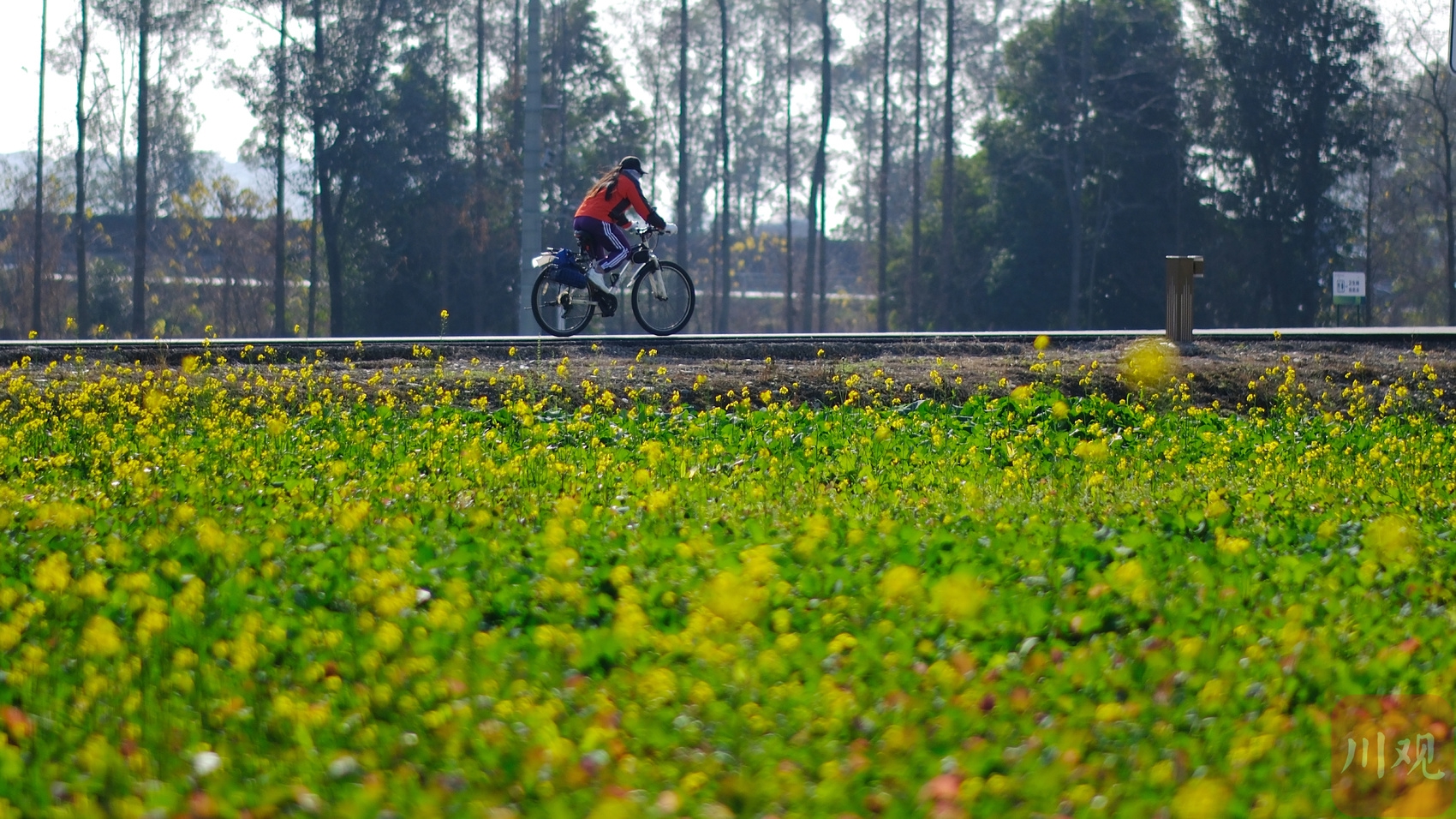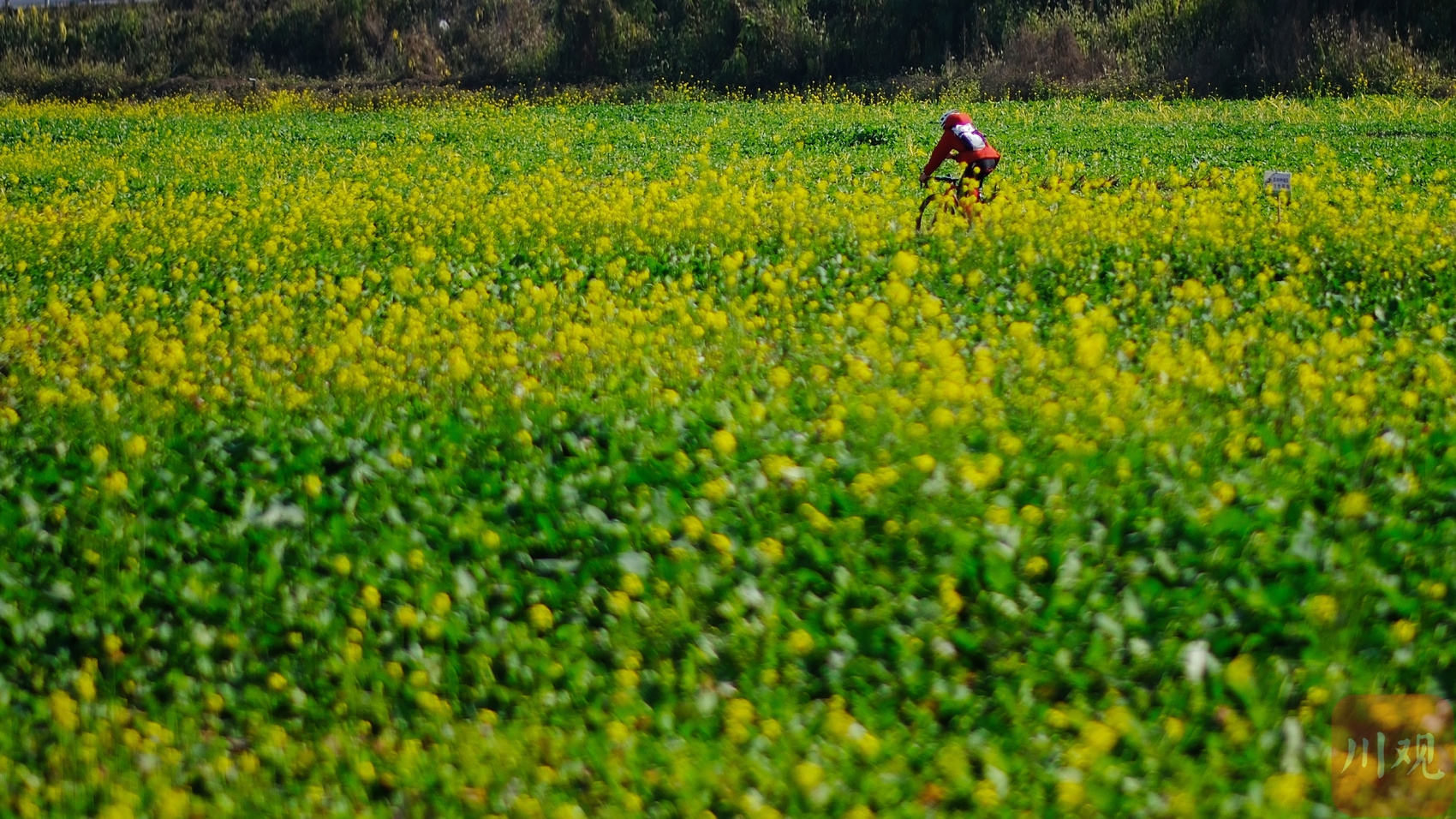 成都市郫都区环城绿道旁的早花油菜田内,骑行爱好者穿梭在冬日金黄花海中。